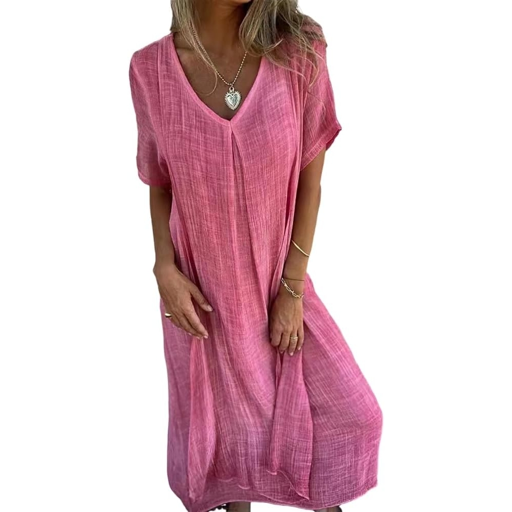 [棉麻材料] 这款连衣裙由优质棉麻混纺制成,具有自然透气性和轻盈感,非常适合春夏过渡时期。这种面料结合了棉的柔软性和亚麻的质地,确保了舒适性和轻松、朴实的美感 [设计特点] 讨人喜欢的V领拉长了脖子,而短袖则为温和的天气提供了恰到好处的覆盖。休闲宽松版型,这件衣服可以毫不费力地垂在身上,提供舒适的合身感,适合各种尺寸。褶皱飘逸设计创造优雅的动作,微妙的褶边增添质感和维度。纯色设计体现了极简主义的优雅。柔和鲜亮的色调与天然面料相得益彰。