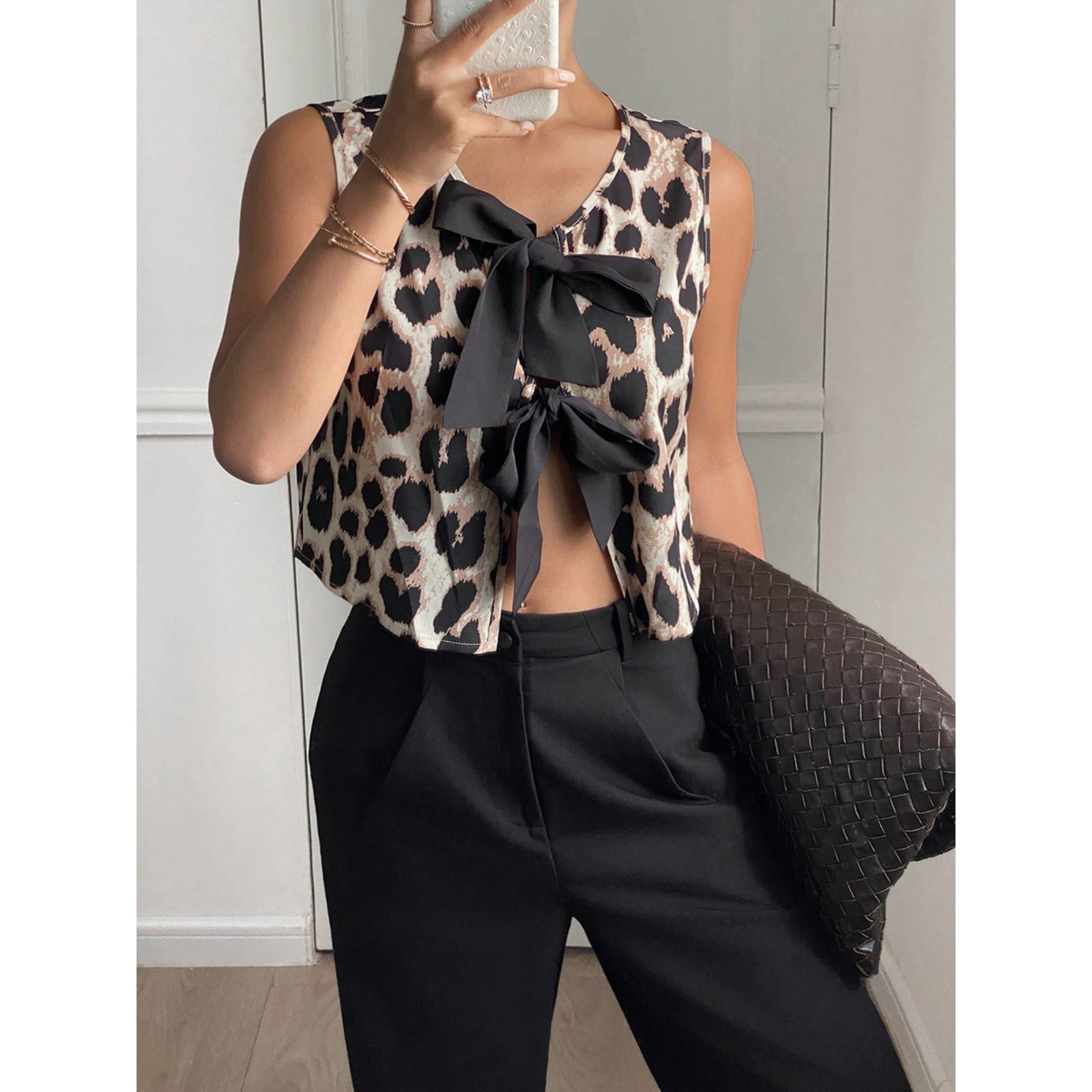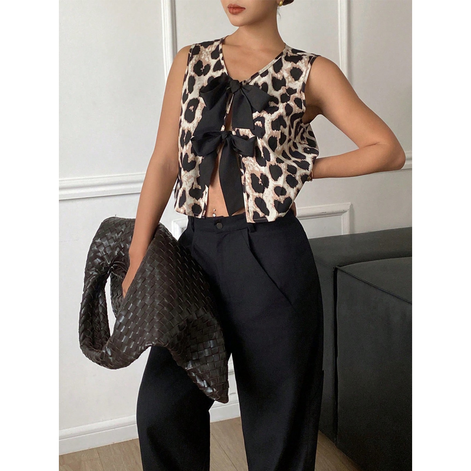 Women's Leopard Print Tie-Front Vest - Sleeveless Open Cardigan with Adjustable Belt for Statement Layering