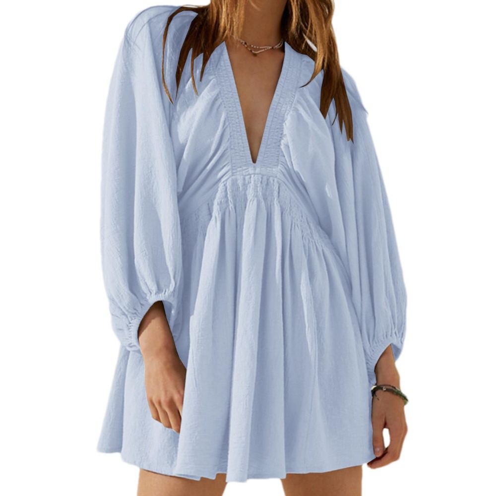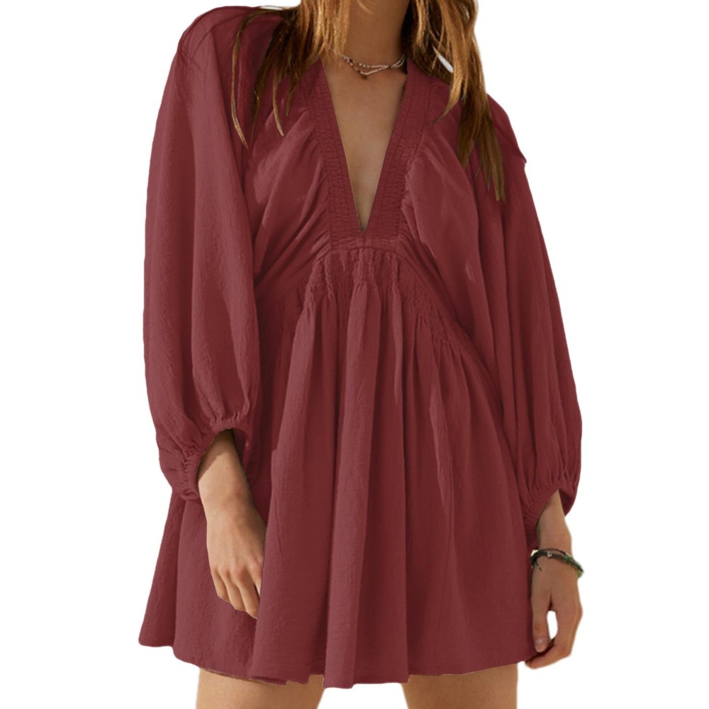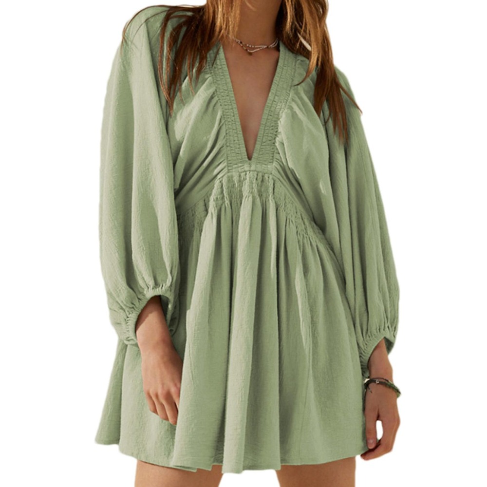 【产品】这款女式v领长袖褶裥a字沙滩迷你裙是时尚与舒适的完美结合。这款多功能的单品旨在让你看起来毫不费力地时髦,无论你是沿着海岸线漫步还是享受休闲的一天。将讨人喜欢的轮廓与时尚的细节相结合,这条裙子是你夏天衣橱里的必备之选 【讨人喜欢的v型领口&长袖】经典的v型领口拉长了脖子,为你的造型增添了一丝优雅。它巧妙地突出了你的锁骨,创造了女性化和诱人的吸引力。长袖提供额外的覆盖,使其成为凉爽的海滩夜晚或白天防晒的理想选择。袖子的设计轻松舒适,确保您可以自由移动,同时保持时尚的外观 【迷人的褶皱细节】精致的褶皱点缀,为您的着装带来动感和质感。从腰部垂下的褶皱,在你走路的时候创造出一个充满活力和引人注目的效果。它们不仅增加了视觉上的乐趣,而且还有助于裙子的讨人喜欢的a字形状,掠过你的曲线,轻轻地向下摆伸展,以增强身材 【a字沙滩迷你裙】这款裙的a字裙廓形非常讨人喜欢,紧贴上身,并逐渐向下摆延伸,创造出平衡和显瘦的效果。在沙滩上穿迷你裙再合适不过了,既能让你展示美腿,又能让你看起来俏皮又时尚。无论你是搭配凉鞋来营造一种悠闲的氛围,还是搭配坡跟鞋去参加海边晚宴,a字裙的设计都能让你看起来毫不费力地时尚 【优质透气面料】由优质轻质面料制成,这款连衣裙具有出色的透气性和舒适性,是炎热夏日的必备之选。这种材料对皮肤柔软,褶皱美观,提供舒适的适合与你一起移动。它也很耐用,易于护理,即使多次洗涤也能保持它的形状和颜色。质量和舒适的结合使这件衣服适合整天穿着 【适合任何场合】这件v领长袖褶裥a字沙滩迷你裙非常百搭。你可以把它当做沙滩外套,白天的休闲连衣裙,或者搭配一些配饰参加晚上的聚会。它永恒的设计和讨人喜欢的剪裁使它适合各种夏季活动,从海滩度假、野餐到户外派对。它也是送给时尚朋友或家人的绝佳礼物。不要错过现在的订单,拥抱一个既时尚又适合海滩的造型