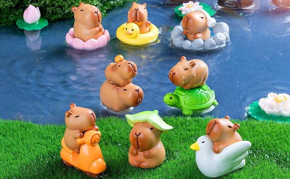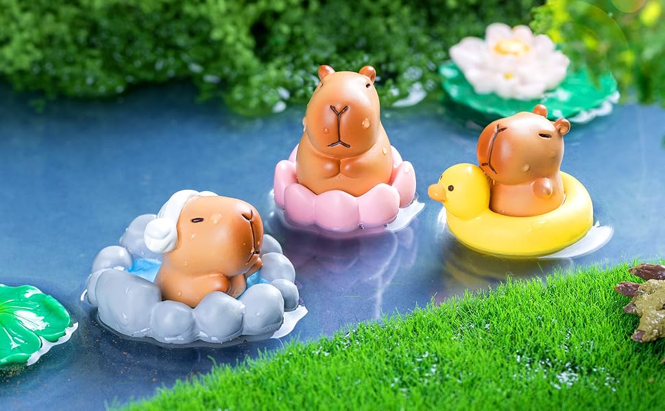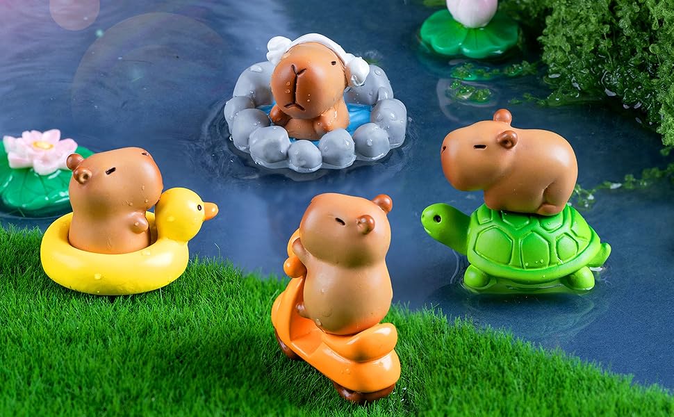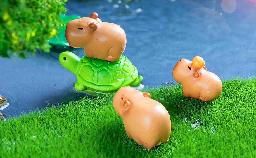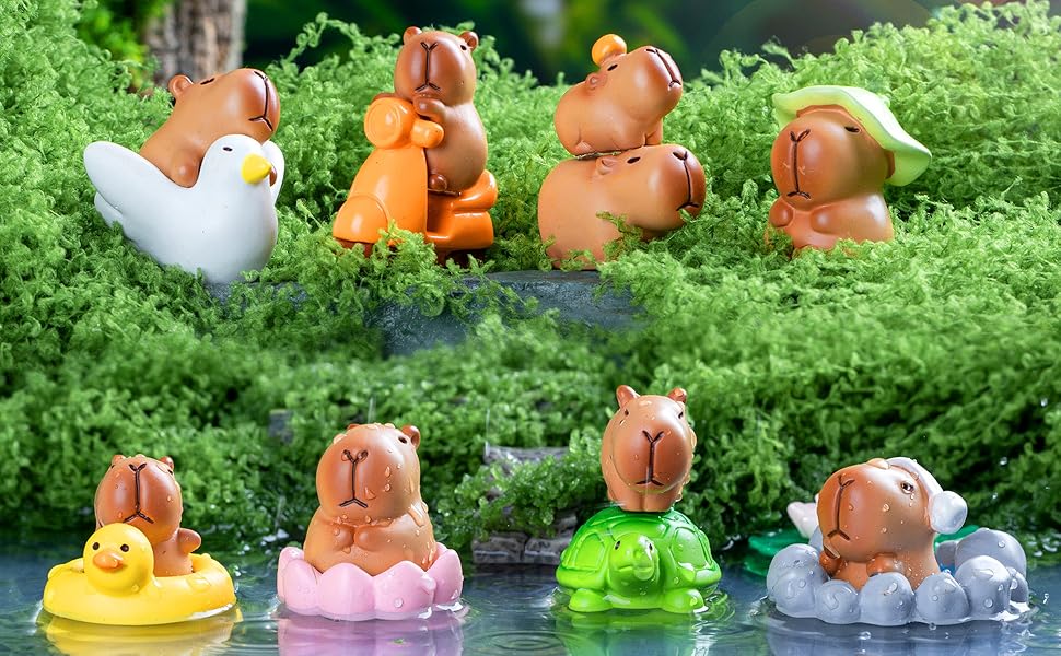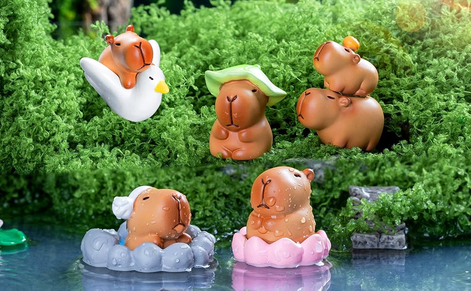 HIGH QUALITY: Our miniature figurines are made of resin material, reliable and reusable, safe and sturdy, lightweight and smooth, not easy to break or fade, which can serve you for a long time, and you can use them with confidence. ENJOY MINIATURE DIY FUN: Our mini capybara figures playset is realistic, vibrant and bright which especially suitable for DIY your crafts, mini fairy garden and micro landscape plants. You can use them to create your own fairy garden, suitable for miniature garden, plant decoration, nice gift for your children and family, build a fairy world with these frogs and mushrooms. DIY DECORATION: You can give capybara toy as a birthday, party, or holiday gift to your friends and family. You can create exquisite micro decorations yourself or use them as cake decorations to enjoy the fun of craftsmanship, stimulate your imagination and creativity, and cultivate hands-on skills.