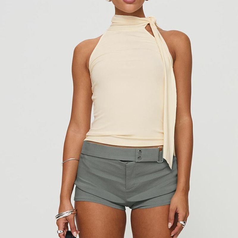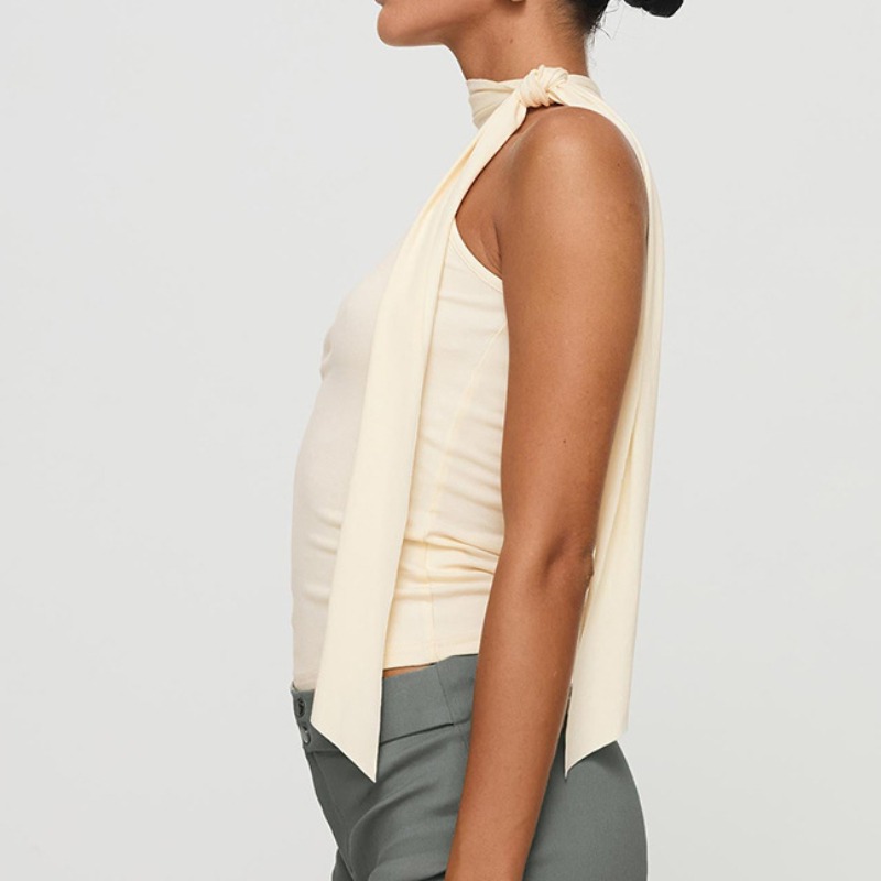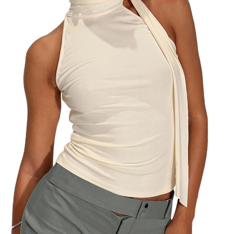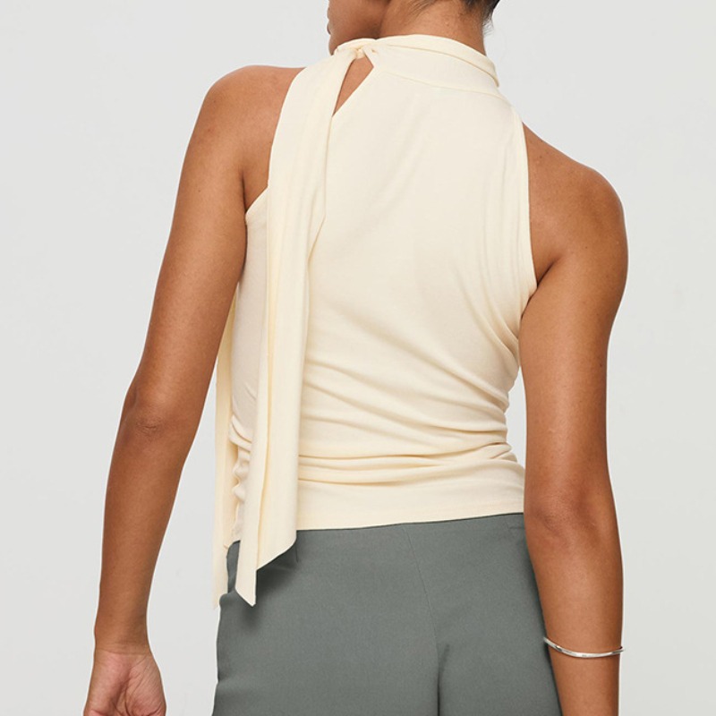 纯色无袖高领绑结飘带T恤上衣女