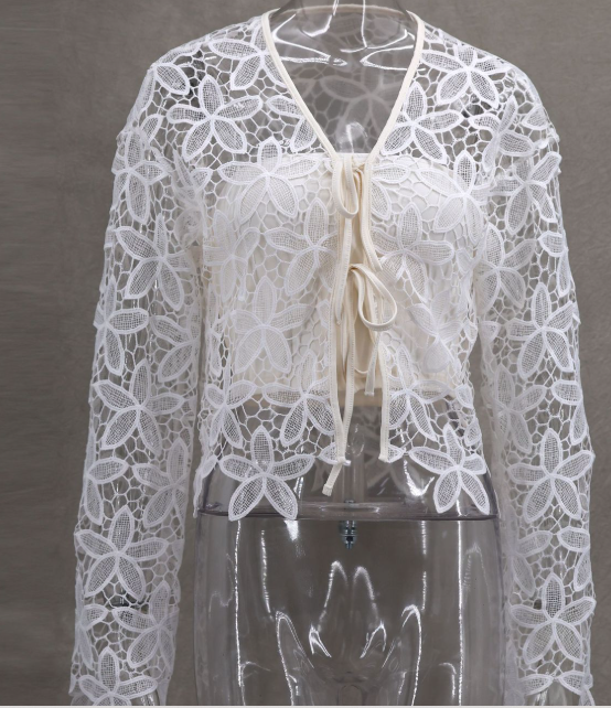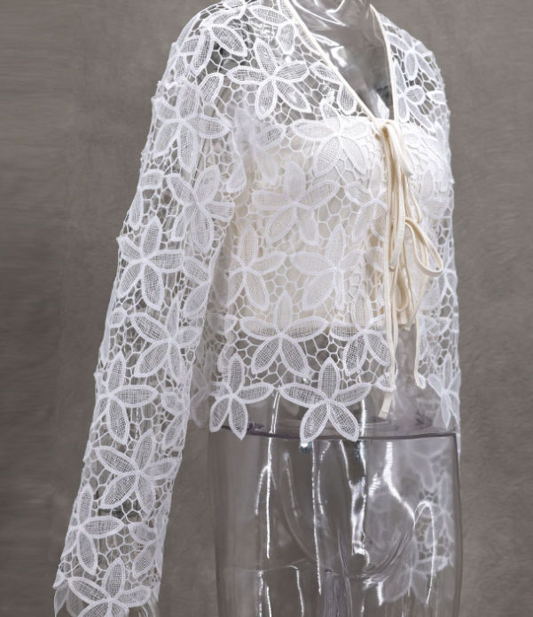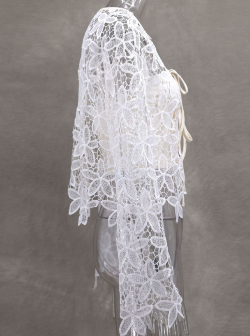 材质:女式夏季蕾丝透视衬衫上衣采用95%涤纶和5%氨纶制成,亲肤,柔软透气,穿着舒适,适合夏、春、秋三季穿着。 特点:女式蕾丝开衫,纯色修身基础款衬衫上衣,蕾丝女士透明露脐上衣,喇叭形长袖深v领上衣,正面开衫,女士紧身束腰衬衫露脐上衣,更能展现你的身材,优雅迷人。 设计:该款女式长袖蕾丝衬衫风格甜美简约,蕾丝碎花开衫,纯色白色女式蕾丝开衫上衣,前襟系上蕾丝设计,容易穿脱。 场合:女性性感透视白色蕾丝开衫适用于休闲的日常生活、学校、办公室、工作、逛街、约会、聚会、生日、旅游、度假、夏日沙滩、逛街、或其他场合。 理想礼物:蕾丝开衫,适合女性,适合作为生日礼物,节日礼物,周年纪念礼物送给你的妻子或女朋友,为她的衣橱增添惊喜。