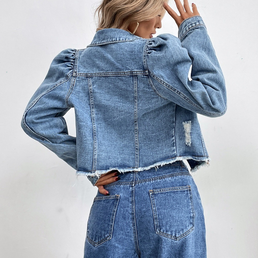 Women’s Stylish Lapel Denim Cropped Jacket Western Casual Short Denim Coat Western-Inspired Short Denim Jacket with Lapel Fashionable Crop Outerwear