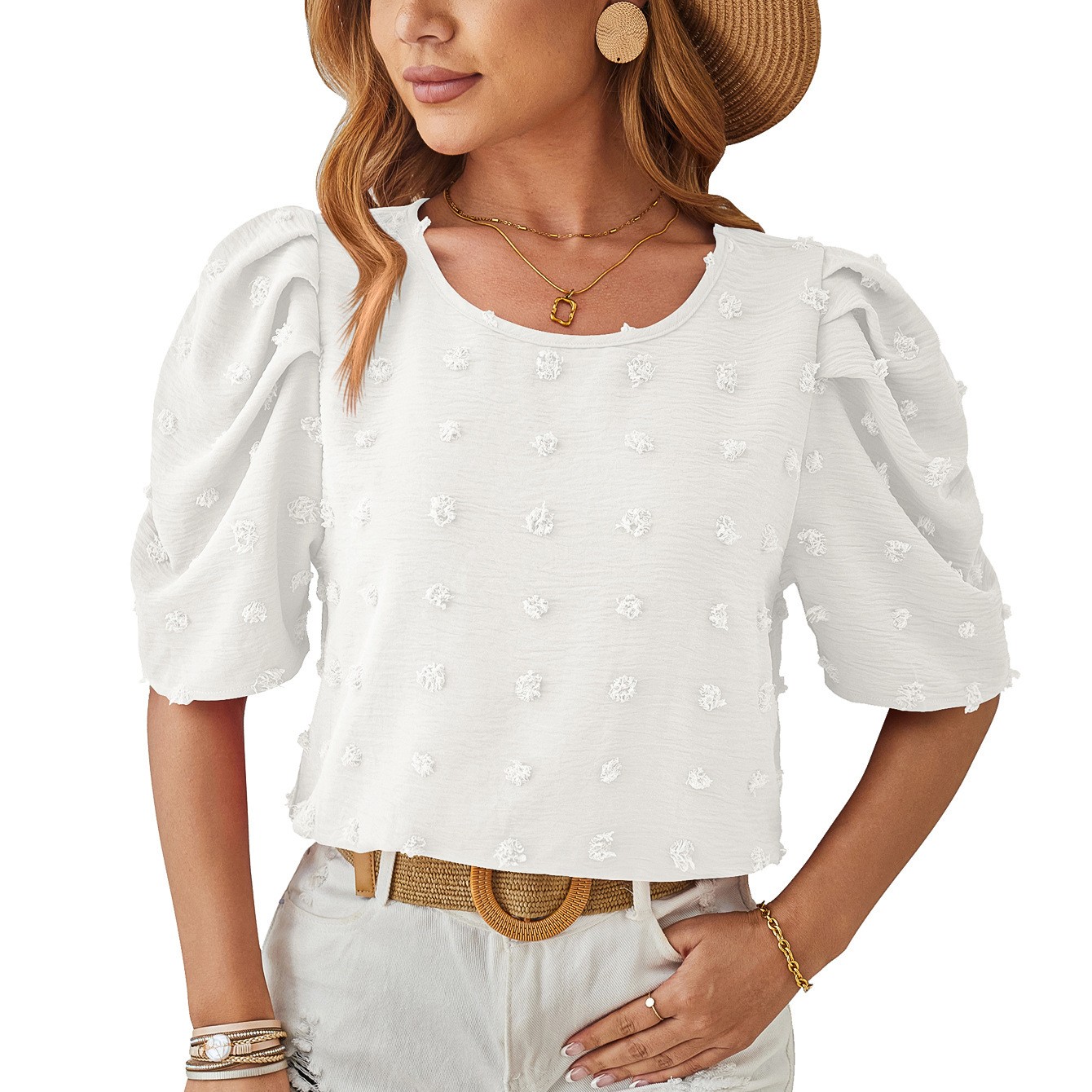 About this item 【PRODUCT】Step into the spotlight with our New Short-Sleeve Square Neck Bubble Sleeve Top, a trendy piece that marries playful details with relaxed comfort. Featuring a flattering square neckline, voluminous bubble sleeves, intricate crochet 5/8 sleeves, and a loose fit, this pullover is perfect for creating stylish, statement looks 【FLATTERING SQUARE NECKLINE】The top showcases a classic square neck design that frames the collarbone beautifully, adding a touch of vintage-inspired elegance. The straight neckline creates a structured yet feminine silhouette, highlighting your shoulders and drawing attention to your upper body. Whether paired with a delicate necklace or left bare, the square neck makes a sophisticated style statement 【DRAMATIC BUBBLE & CROCHET SLEEVES】Stand out with the unique combination of voluminous bubble sleeves and intricate crochet 5/8 sleeves. The bubble sleeves add a fun, dramatic flair, creating a playful, eye-catching look, while the crochet detailing on the mid-length sleeves brings a delicate, artisanal touch. The contrast between the bold bubbles and the airy crochet texture adds depth and visual interest, making this top a true fashion standout 【RELAXED LOOSE-FIT DESIGN】Designed with a loose, oversized fit, this pullover offers a comfortable and laid-back feel. The roomy cut skims over your body, providing a flattering look for various body types without clinging. Whether you’re running errands, meeting friends, or lounging at home, the loose fit ensures unrestricted movement and a casually stylish vibe 【SOFT & BREATHABLE FABRIC】Crafted from high-quality, lightweight fabric, this top feels soft against the skin and offers excellent breathability. The material drapes gracefully, enhancing the loose silhouette and ensuring all-day comfort. Its durability means it maintains its shape and color wash after wash, making it a reliable addition to your wardrobe 【VERSATILE STYLE FOR ANY OCCASION】This Square Neck Bubble Sleeve Crochet 5/8 Top is incredibly versatile. Pair it with high-waisted jeans and sneakers for a casual street style, or tuck it into a midi skirt and add heels for a more dressed-up look. Suitable for a wide range of occasions, from weekend brunches and outdoor events to shopping trips and casual work settings, its trendy design and comfortable fit make it a must-have for fashion-forward women. Don’t miss out—order now and embrace a look that’s both stylish and effortlessly cool