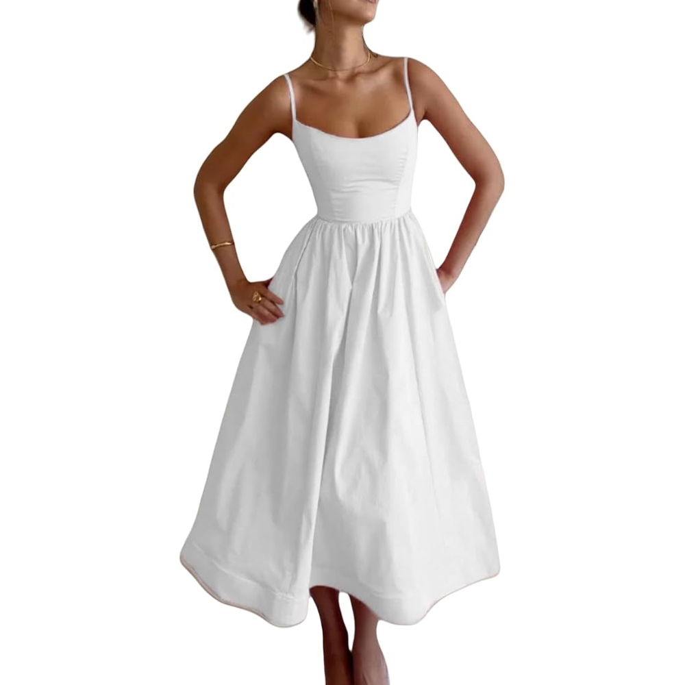 [涤纶面料] 这款连衣裙采用优质涤纶面料,轻盈舒适,耐用耐脏,色彩鲜艳持久,让你在整个夏天都保持时尚舒适 [设计特点] 吊带 U 字领无袖连衣裙展示了平滑的 U 字领口,凸显锁骨,搭配纤细的肩带。紧身胸衣拥抱你的曲线,打造沙漏型轮廓,宽大蓬松的褶皱裙摆优雅地呈 A 字版型,毫不费力地遮住臀部和大腿,修饰身材。简约优雅的纯色设计使其成为适合各种场合的百搭单品