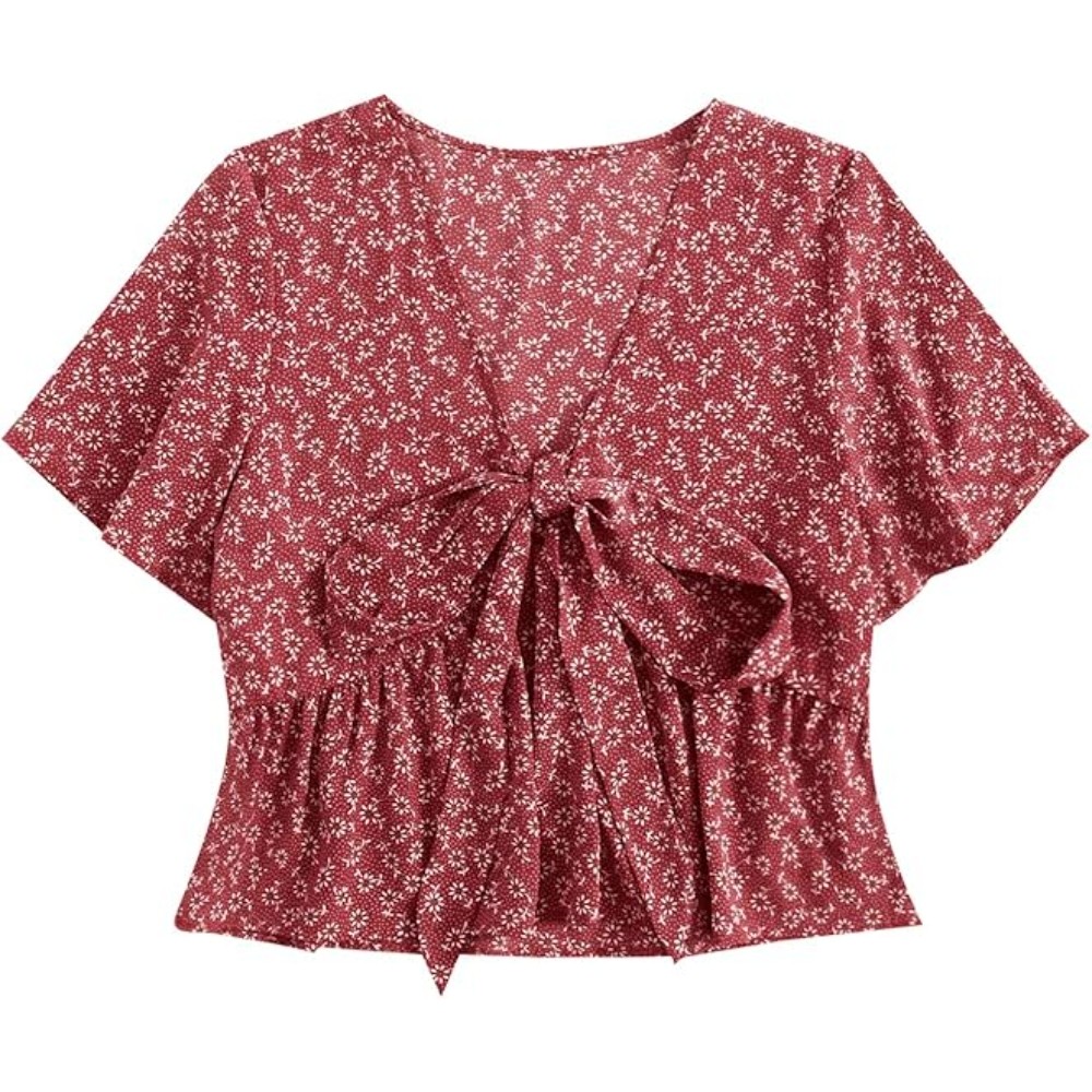 [Polyester Fabric] Made from premium polyester fabric, this shirt is lightweight, comfortable, wrinkle-resistant and durable, ensuring you stay stylish and fresh all summer long [Design Features] This V-Neck Short Sleeve Top features a smooth V-neckline that elongates the neck while the high waisted, loose fit creates a balanced, flattering silhouette. A bow tie at the front is sweet and feminine, while the floral print brings a charming summer vibe. A pleated hem enhances the visual interest and movement of the top