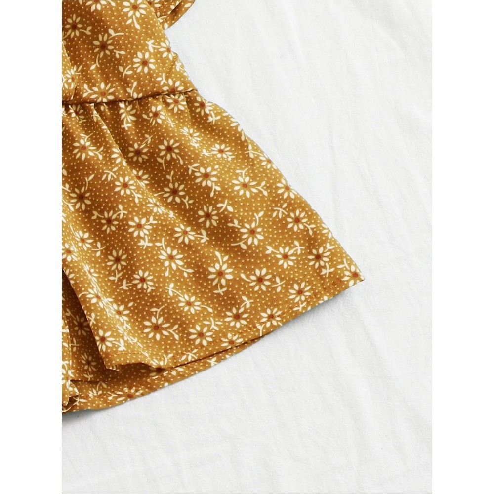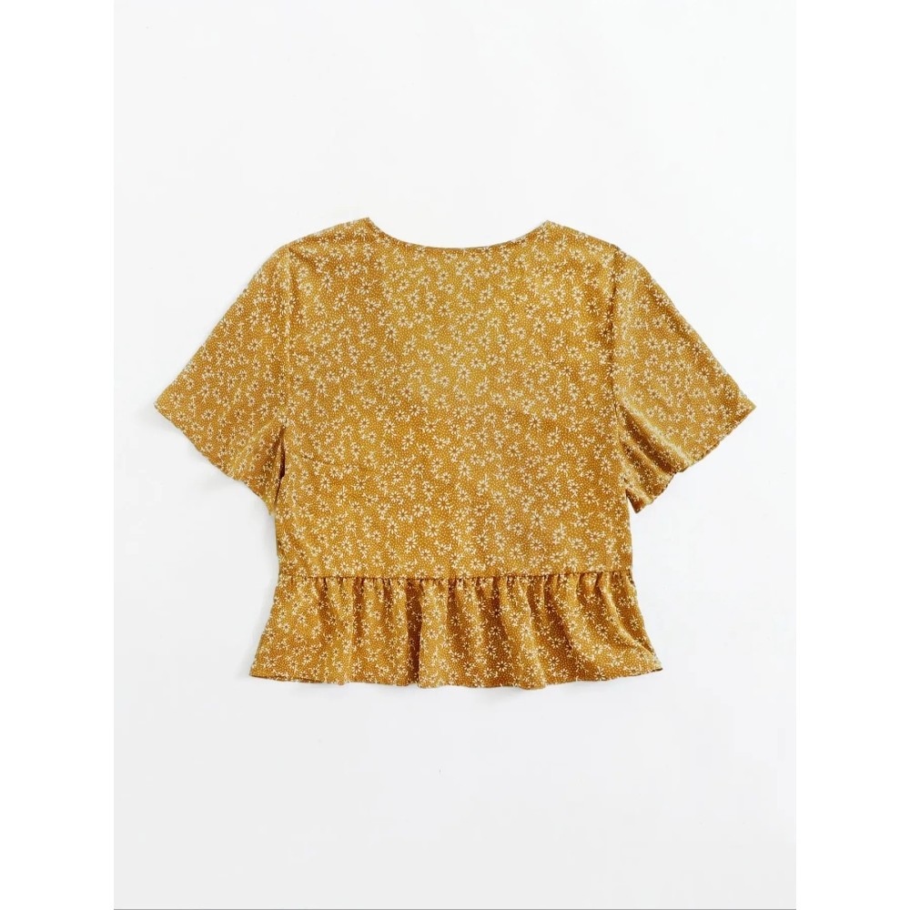 Women's Summer Floral Print V-Neck Blouse - Short Sleeve Ruffle Trim Casual Shirt Lightweight High-Waisted Short Blouse Beach to Street Versatile Peplum Top
