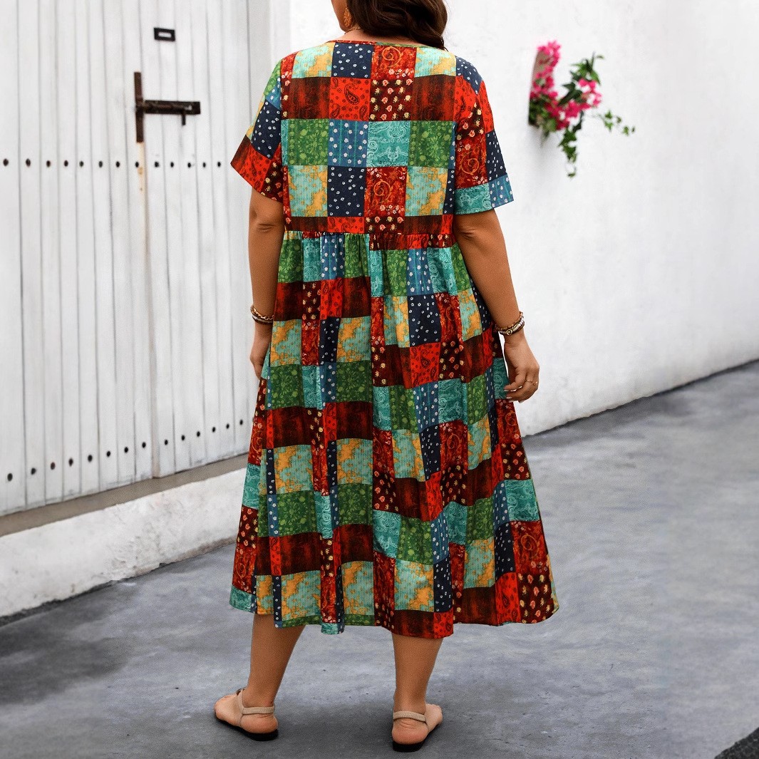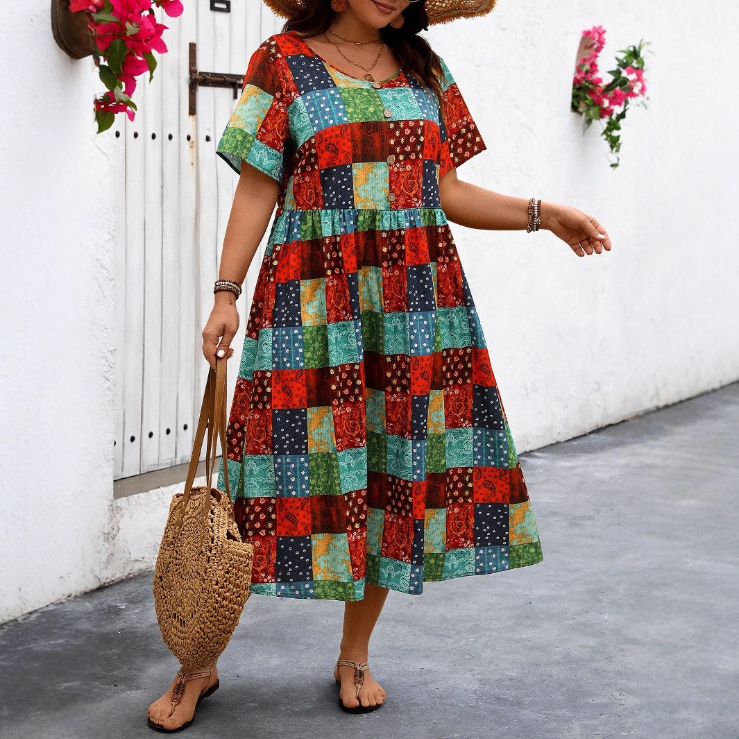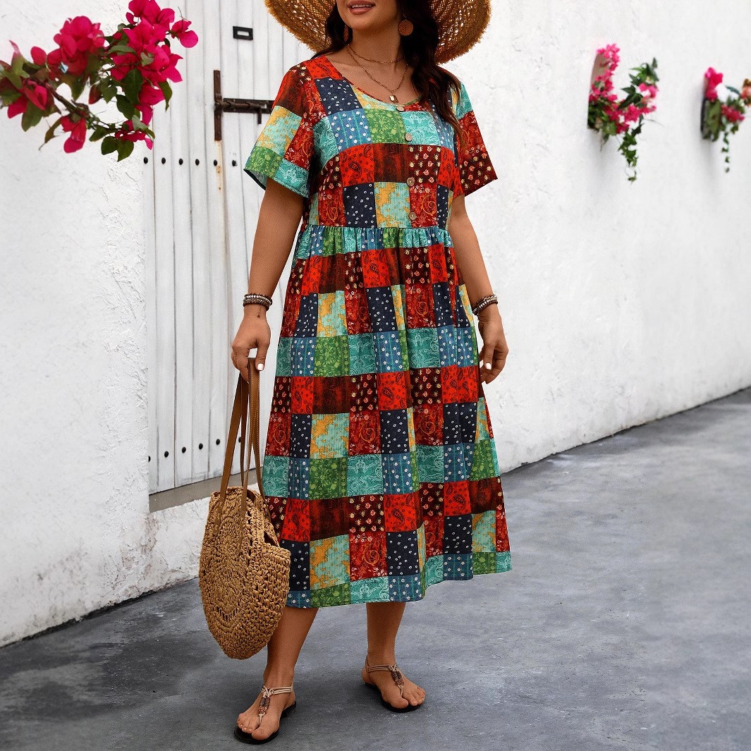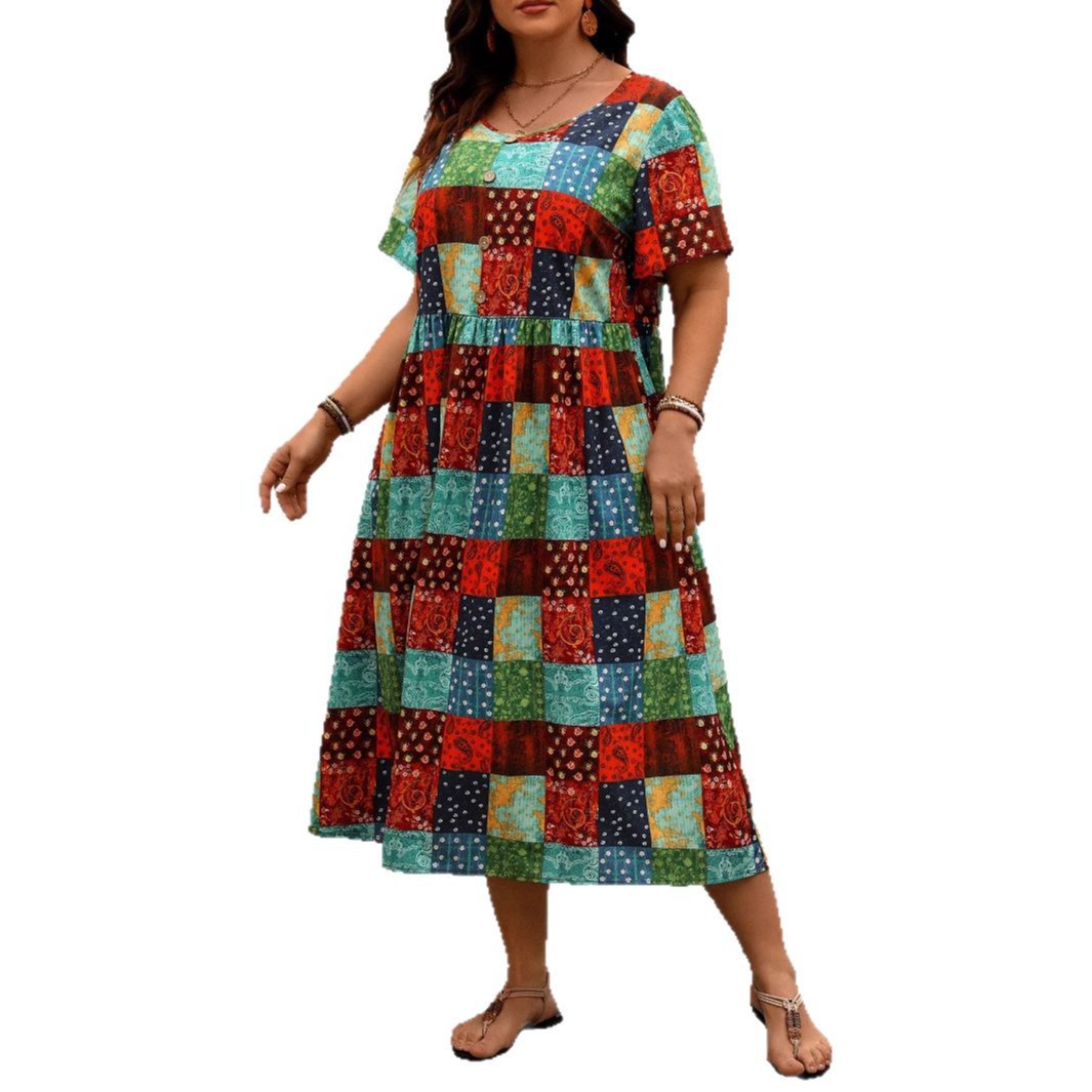 Women's Summer Plus-Size Loose-Fit Round-Neck Printed Maxi Dress Flowy Bohemian-Inspired Long Dress