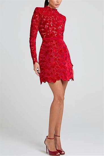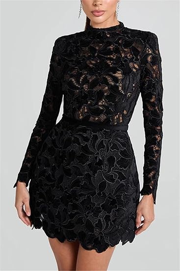 Womens Sexy Long Sleeve Solid Color Lace Crochet Hollow Party Dress Nightclub Dress