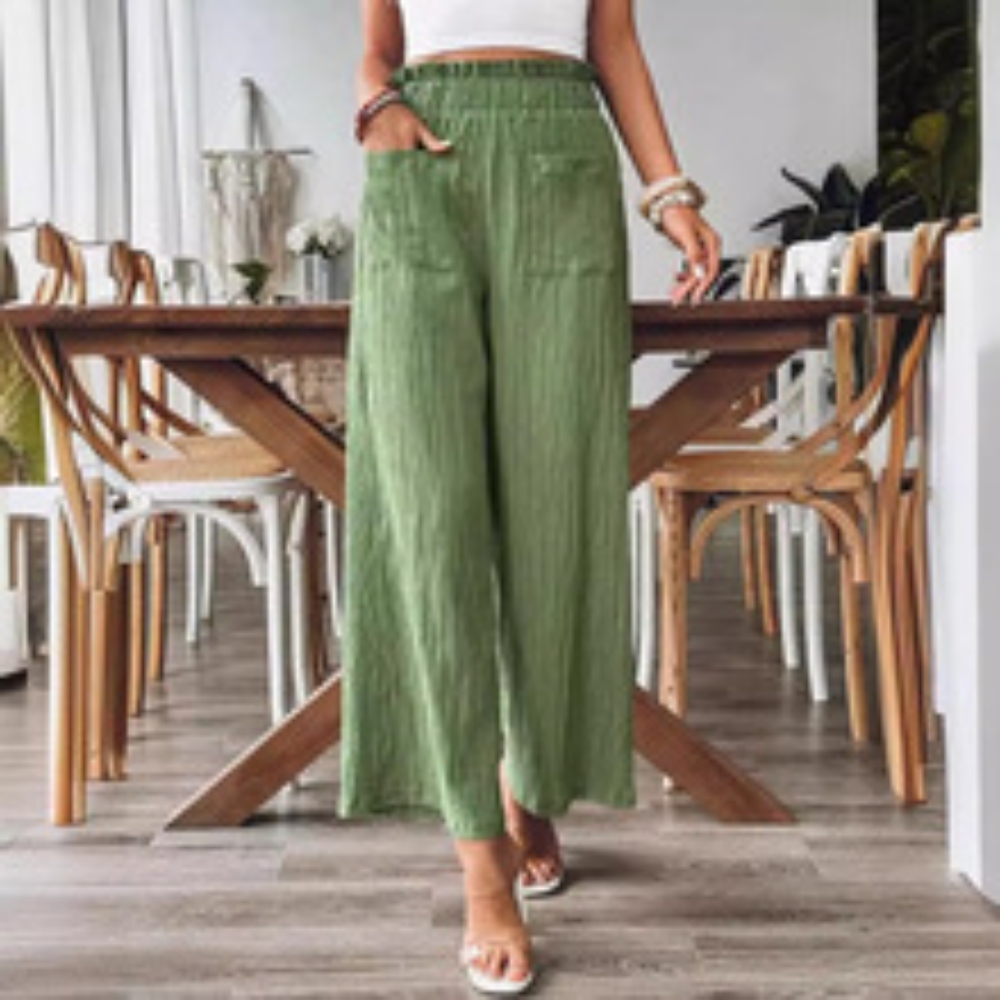[Polyester & Spandex Material] These trousers are made from a blend of polyester and spandex for both the durability of polyester and the fit of spandex. This fabric is smooth to the touch, lightweight and cool, with excellent shape retention for comfortable movement throughout the day [Design Features] Designed with a stretchy high-waist and trimmed with attractive ruffled lace at the edges, these wide-leg trousers are both comfortable and stylish. Front side pockets add practicality and make it easy to carry small essentials. The pleated fabric design creates a textured, sophisticated look, while the solid colour choice sets the stage for a stylish, versatile look. Embodying elegant simplicity, these trousers are suitable for all fashion preferences