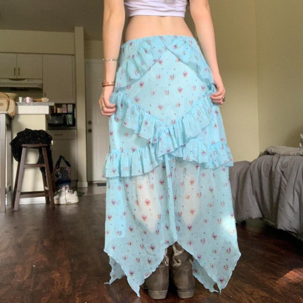 Material: Blue skirt is made of Polyester. This mesh fabric is breathable Features: Mesh midi skirt for women, feature with floral printed and ruffle trim hem design Occasion: This boho Skirts for women midi length suitable for beach, dating, party, holiday Match: Goth skirt is naturally matched with other style blouse, tank tops