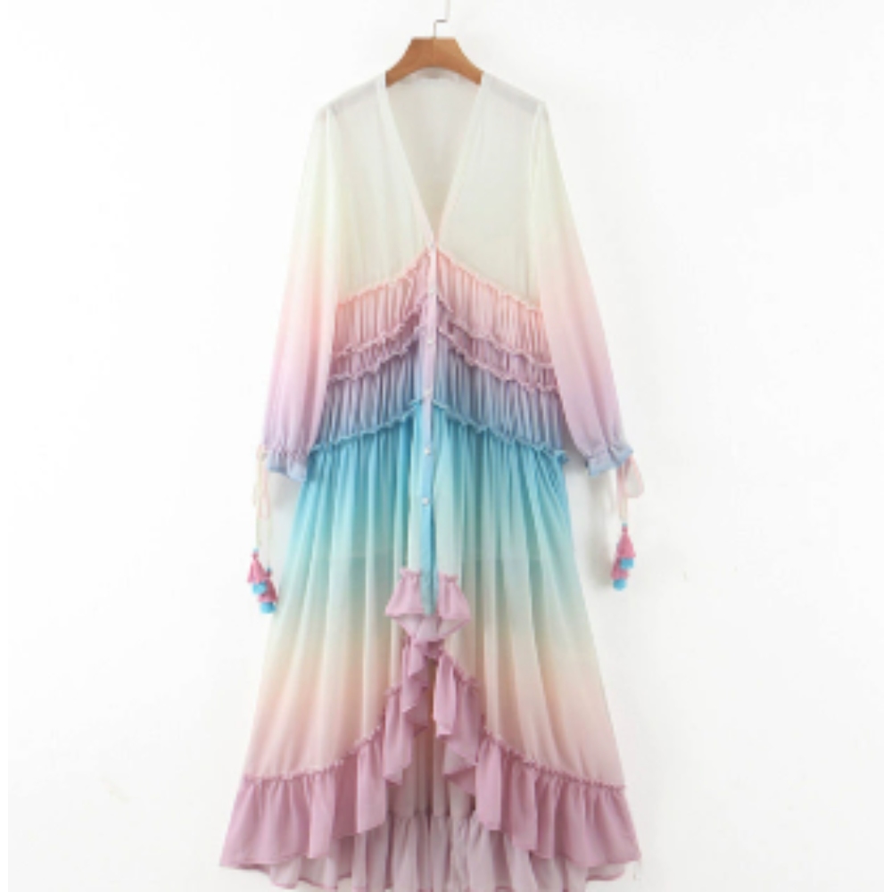 Elegant Boho Style: Our floral print maxi dress features a deep V-neckline and ruffle details, perfect for a vintage-inspired look. Comfortable & Versatile: Made from breathable chiffon, this long dress is ideal for summer, suitable for casual outings or special events. Stylish Design: With its loose silhouette and ankle-length, this dress is designed to flatter and provide a comfortable fit for women aged 18-35. Easy Care: Crafted from a blend of polyester and launon, this dress is easy to maintain and ensures durability for everyday wear. Fashionable & Unique: The irregular print and ruffle decoration make this dress stand out, adding a touch of bohemian charm to any wardrobe.