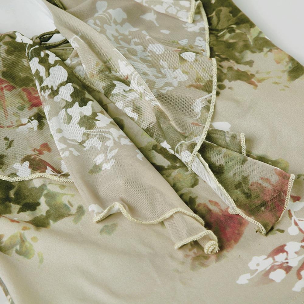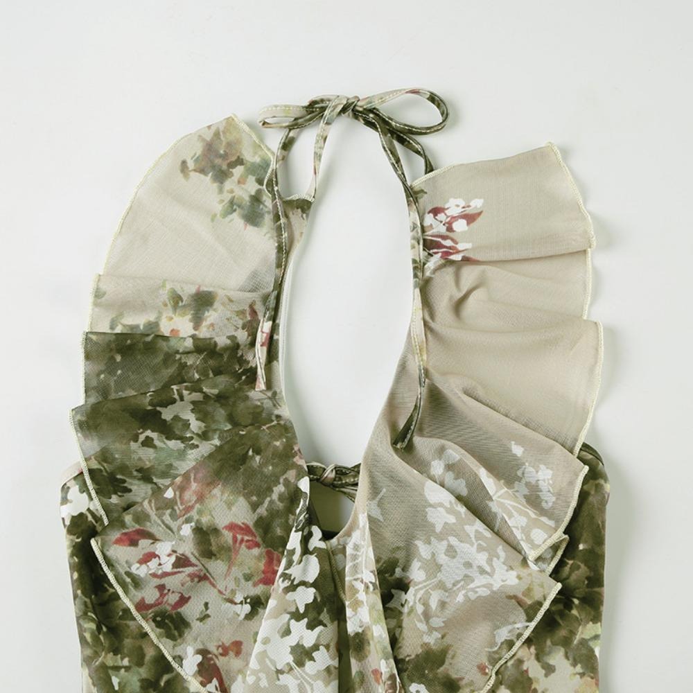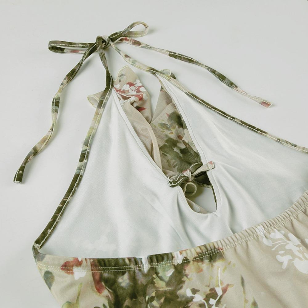 植物系印花网纱荷叶边挂脖露背吊带美式辣妹性感复古系带外穿背心