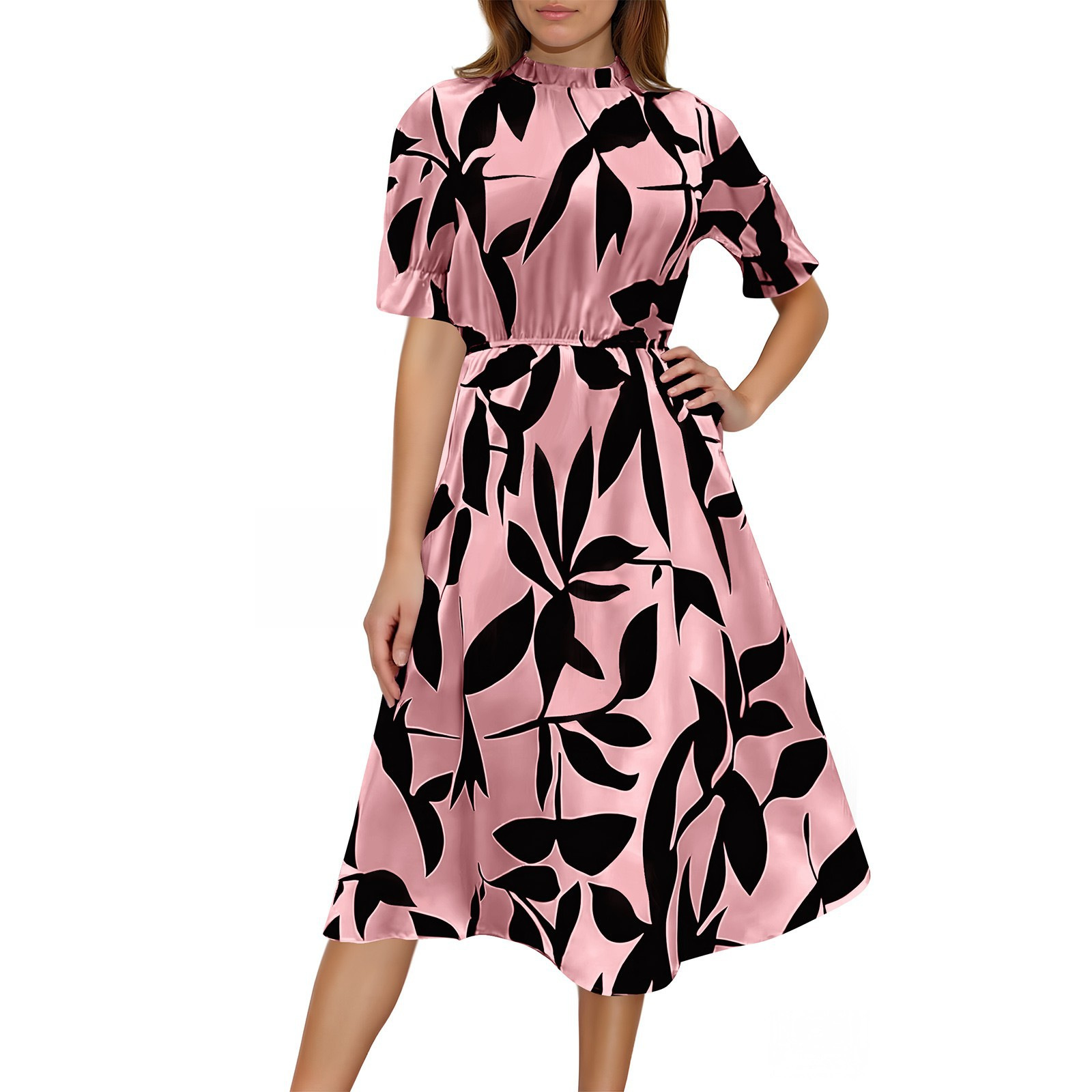 Women's Floral Print Short-Sleeve Dress with Ruffled Stand Collar Elegant Flared A-Line Party Dress