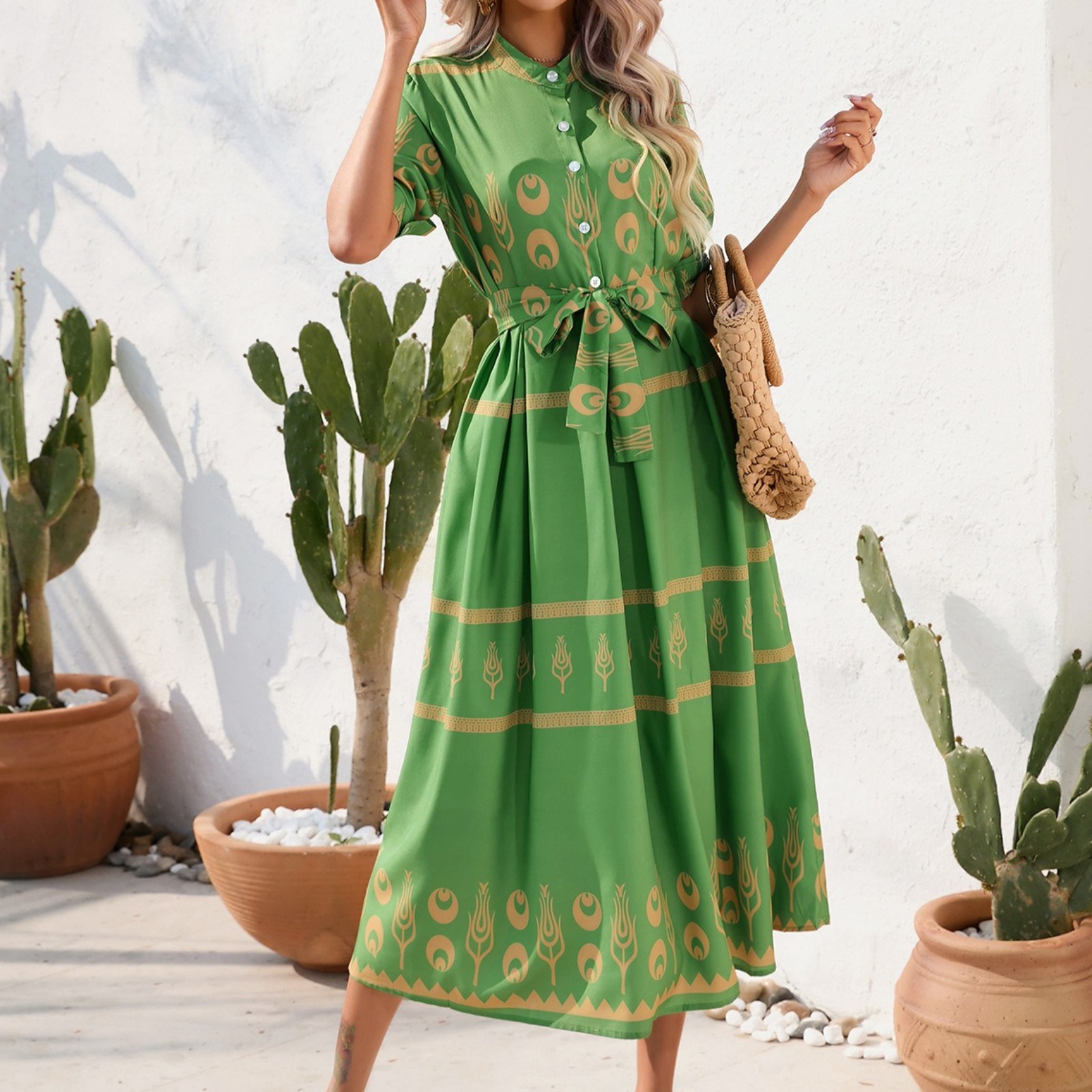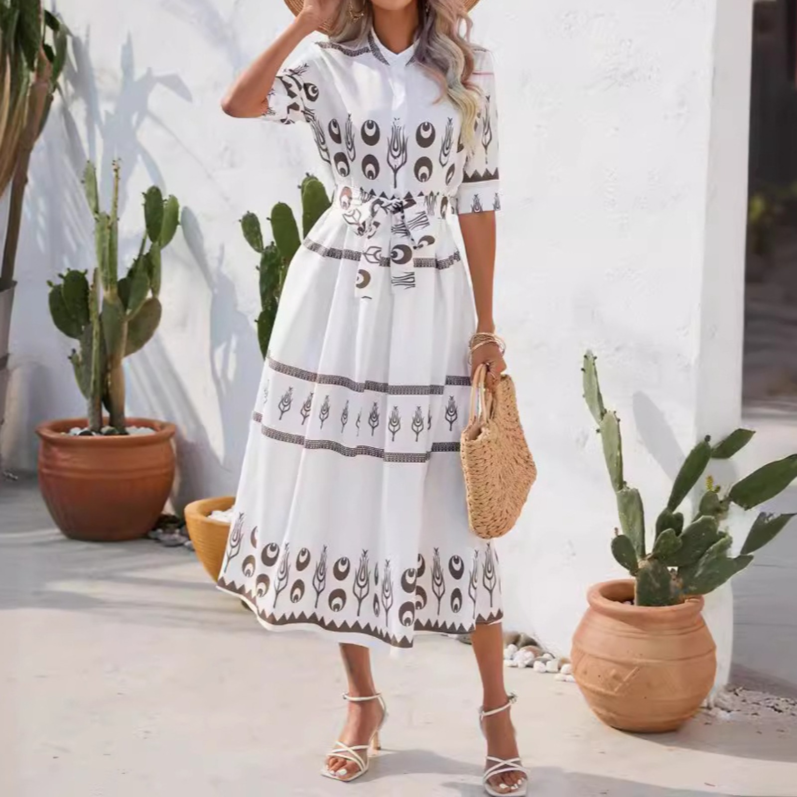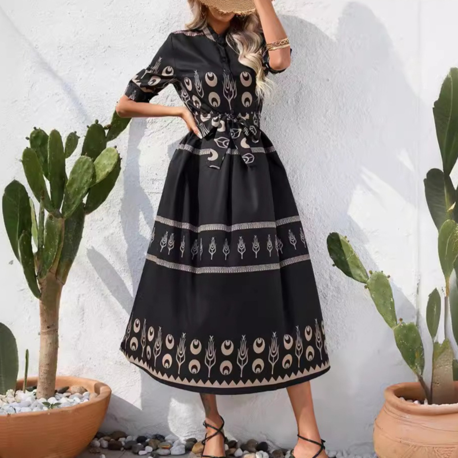 女装欧美夏季名族风印花五分袖连衣裙