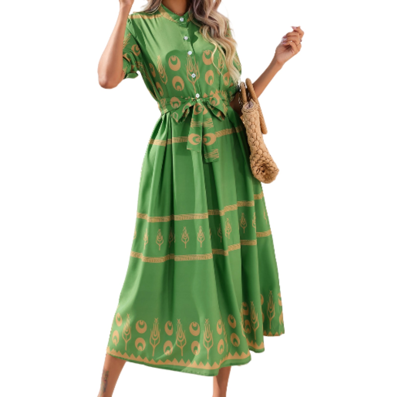 Women's Ethnic Print 3/4 Sleeve Dress High Neck Solid Color Floral Dress Lightweight Polyester Casual Spring Summer Dress