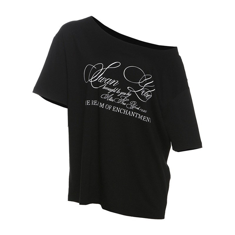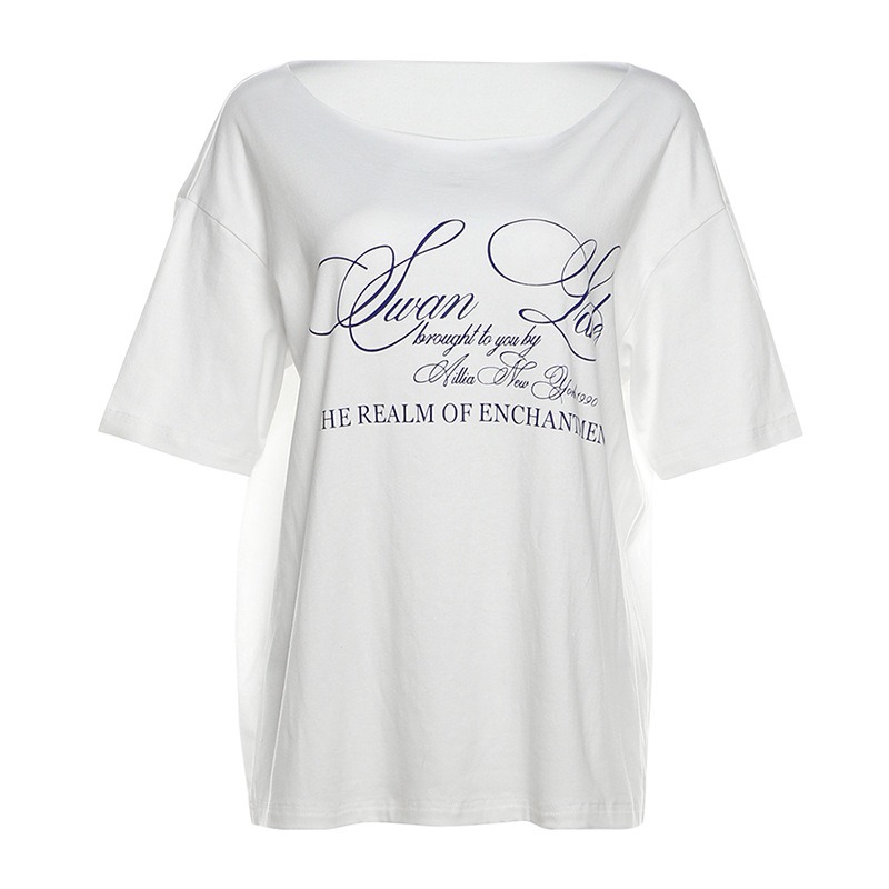 Women's Streetwear T-Shirt Off-Shoulder Loose Fit Top American Style Letter Print Urban Fashion Tee Oversized Casual Wear