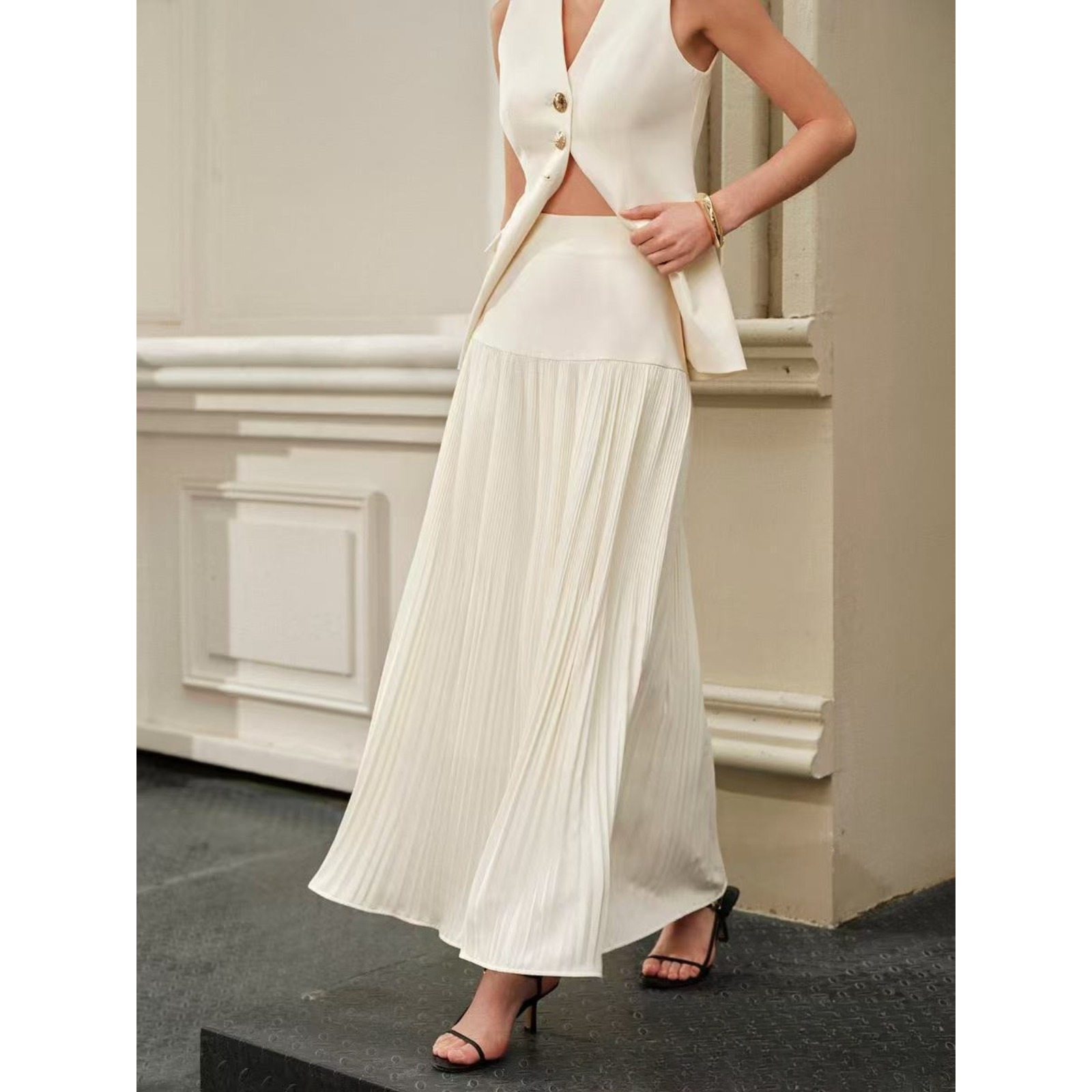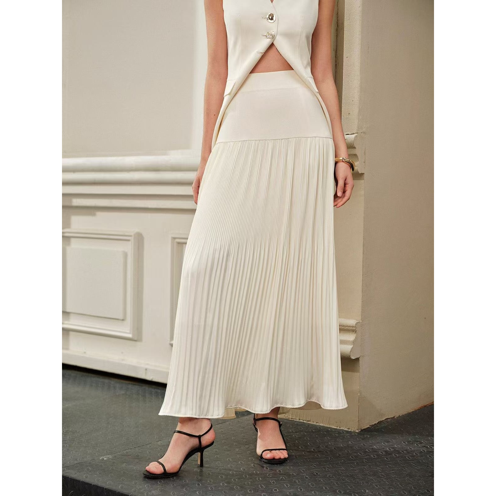 压褶拼接半身裙欧美纯色女装休闲压褶裙