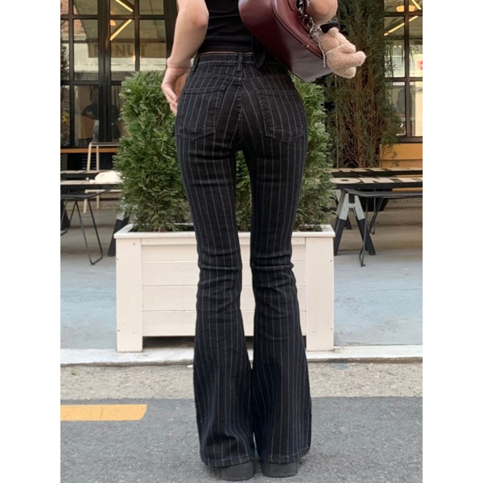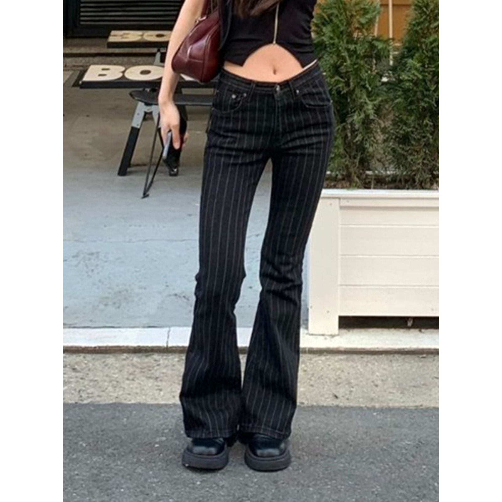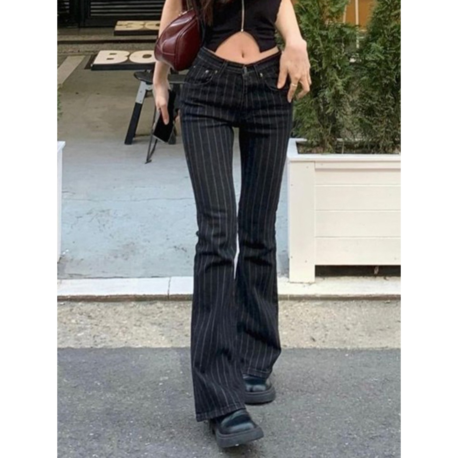 美式街头风酷妹修身条纹撞色喇叭裤跨境新款低腰直筒休闲牛仔长裤