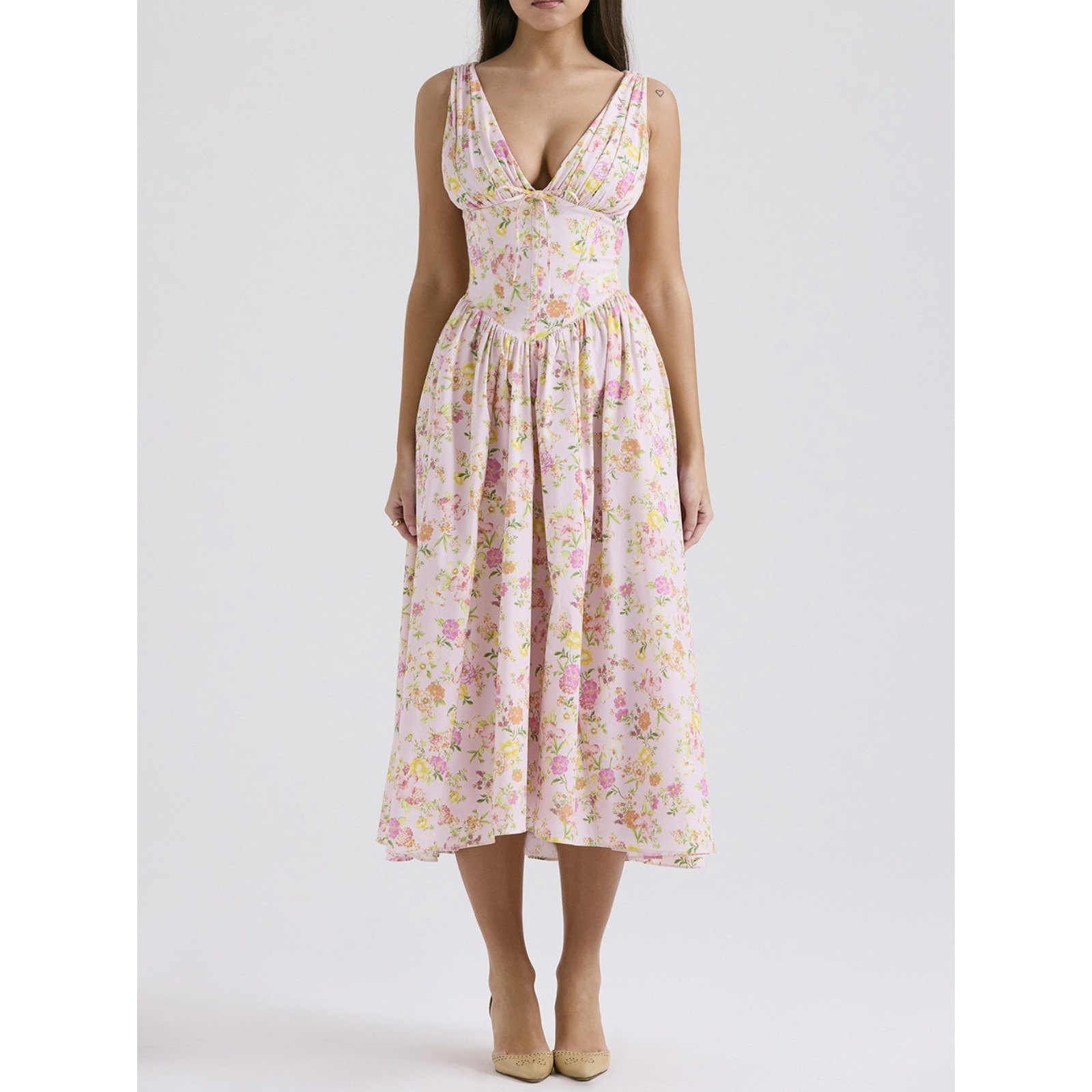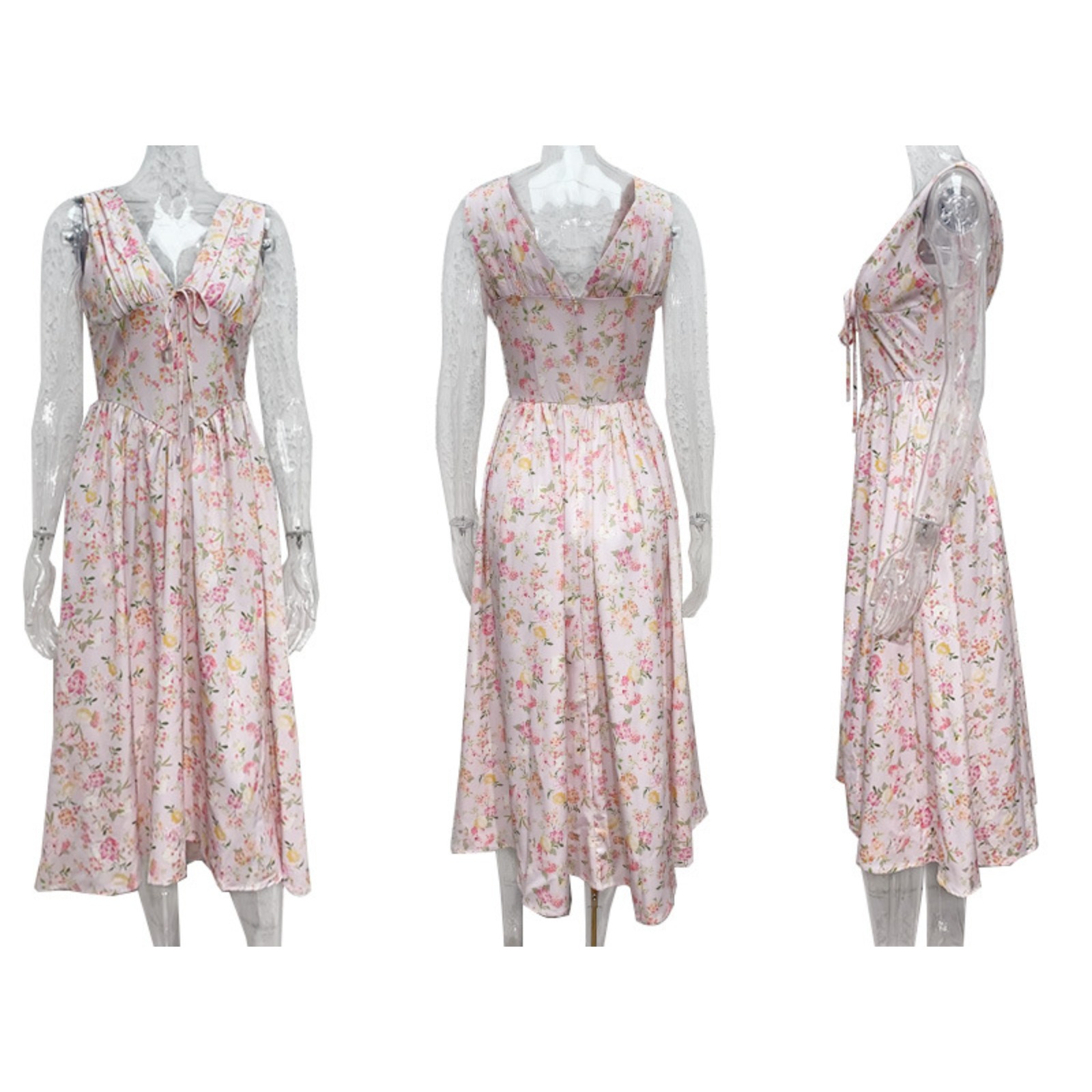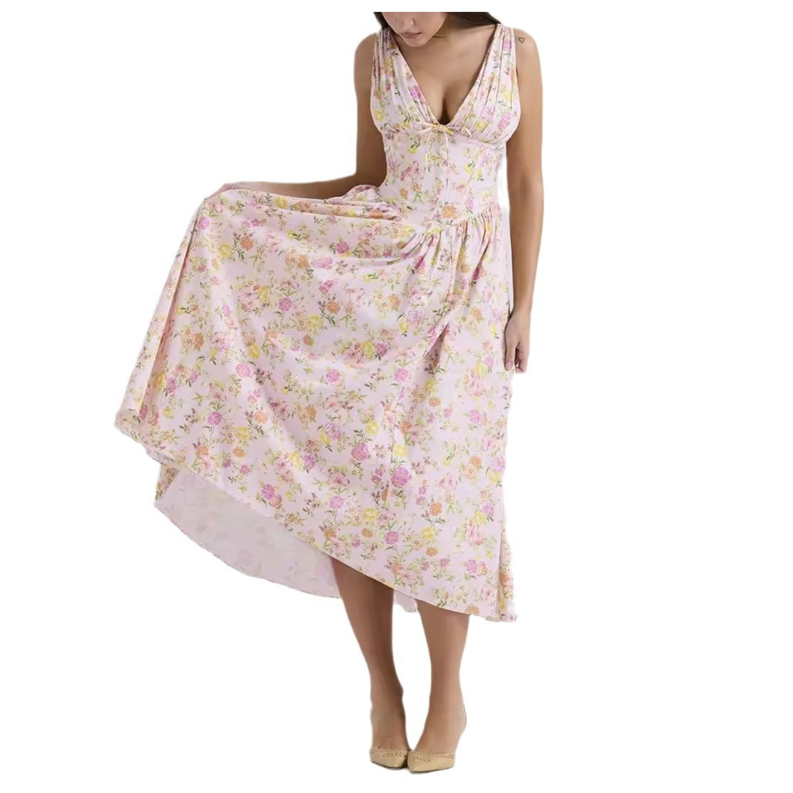 2025 Summer Women's V-Neck Floral Print Slim Fit Midi Dress Adjustable Spaghetti Strap French Style Chiffon Beach Dress with Solid Lining