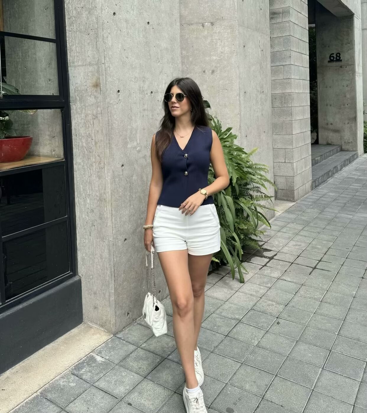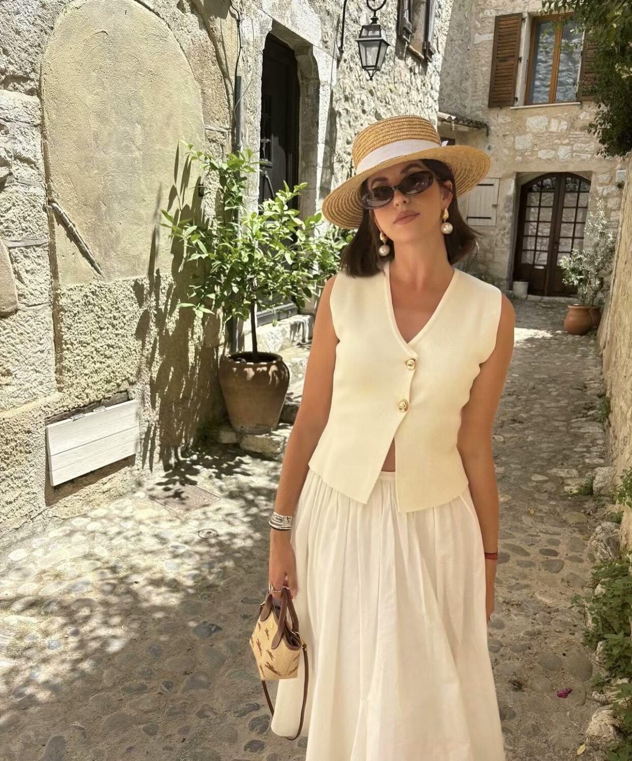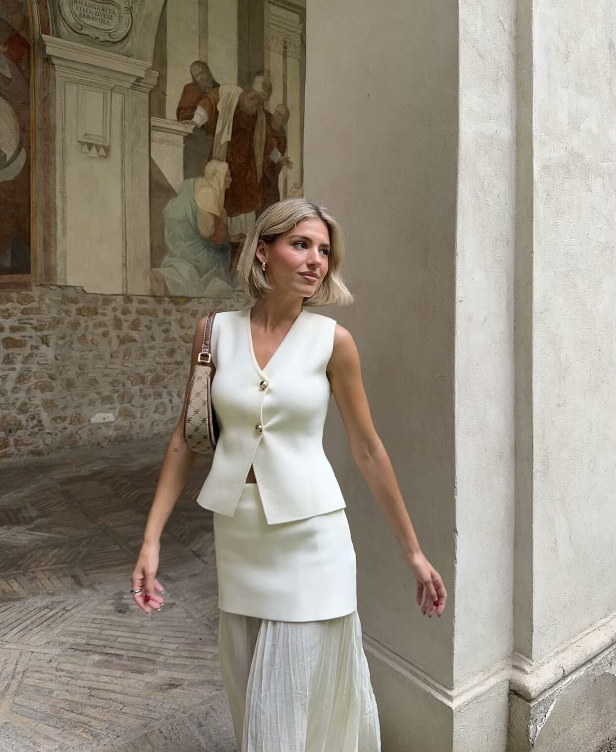 [Polyester Material] This knitted vest is made from a premium polyester fabric with a soft, lightweight knit texture that feels smooth against the skin. The fabric has a subtle stretch for a comfortable fit and retains its shape while ensuring breathability for transitional seasons [Design Feature] The sleek V-neckline elongates the neckline and is layered with a sleeveless silhouette. Two buttons on the front placket add sophisticated detail, while the slim fit gently flatters the body. Available in a range of solid colours, the design embodies elegance, balancing simplicity with sophistication