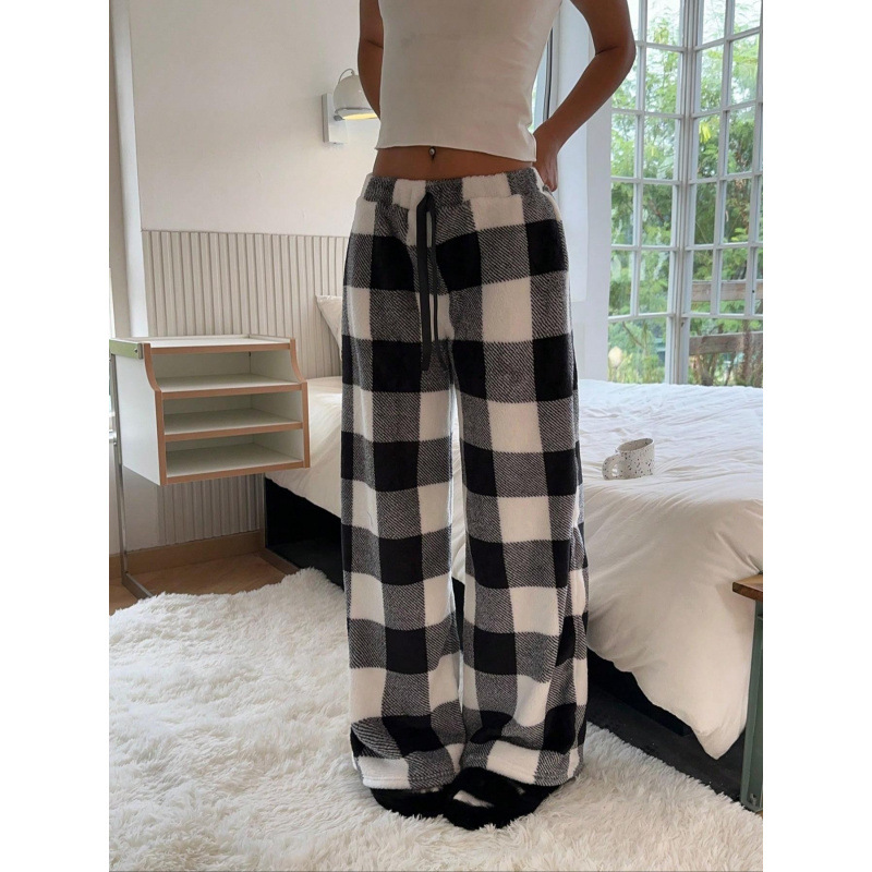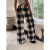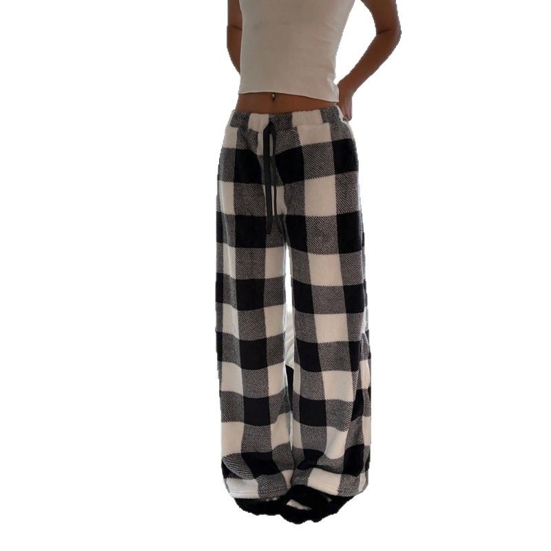 2025夏季宽松休闲格子毛绒直筒裤子女居家休闲