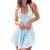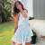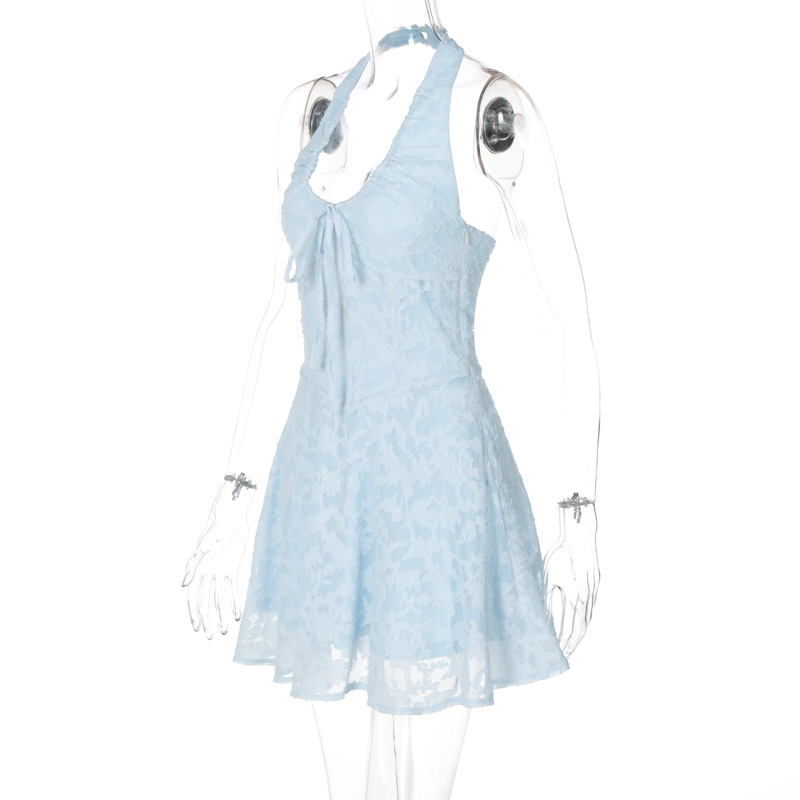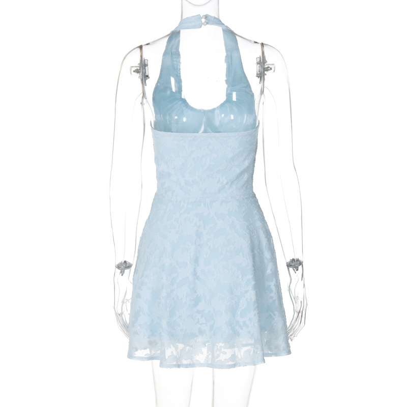 Women's Halter Neck Jacquard Dress Elegant V Neck Ties Sleeveless Backless Lace Up A Line Dress Casual Slim High Waist Swing Petite Beach Party Sundress Summer Blue Lightweight Mini Dress