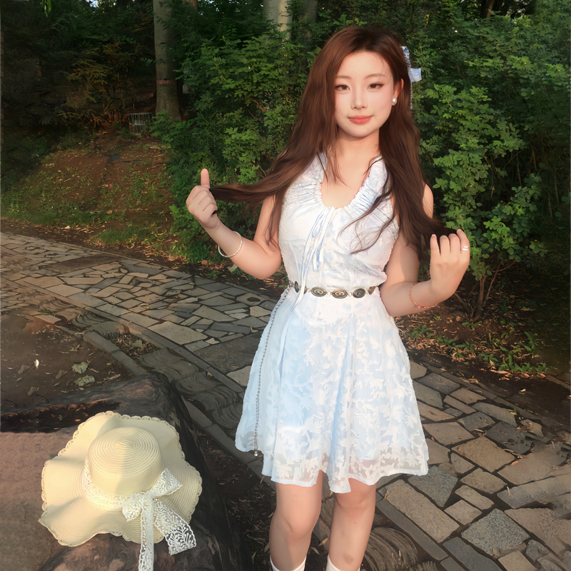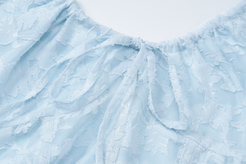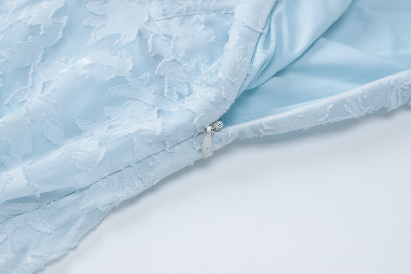 [涤纶面料] 这款可爱的连衣裙采用优质涤纶面料制成,质地光滑轻盈,垂坠感极佳。面料上有复杂的提花图案,具有微妙的伸缩性,穿着舒适,同时保持了光滑的质地,与皮肤接触时感觉柔软,非常适合温暖的天气。 [设计特点] 这款连衣裙采用了大幅无袖设计,勾勒出肩部线条,搭配大胆的露背设计,更显诱人。U 领系带前襟勾勒出妩媚的领口,修身的束腰剪裁凸显曲线美。迷你的长度带来俏皮的感觉,与精致的提花图案相得益彰,提升了造型的档次。整体风格融合了甜美优雅与含蓄性感,适合夏季穿着。