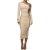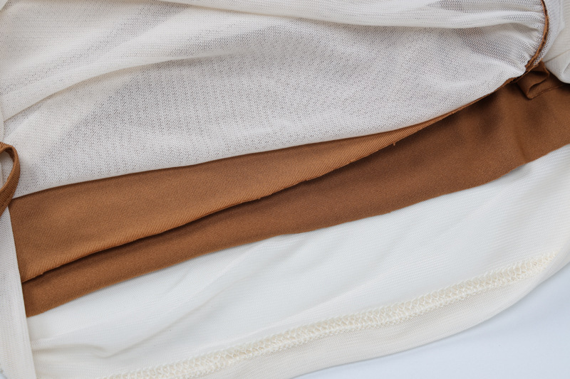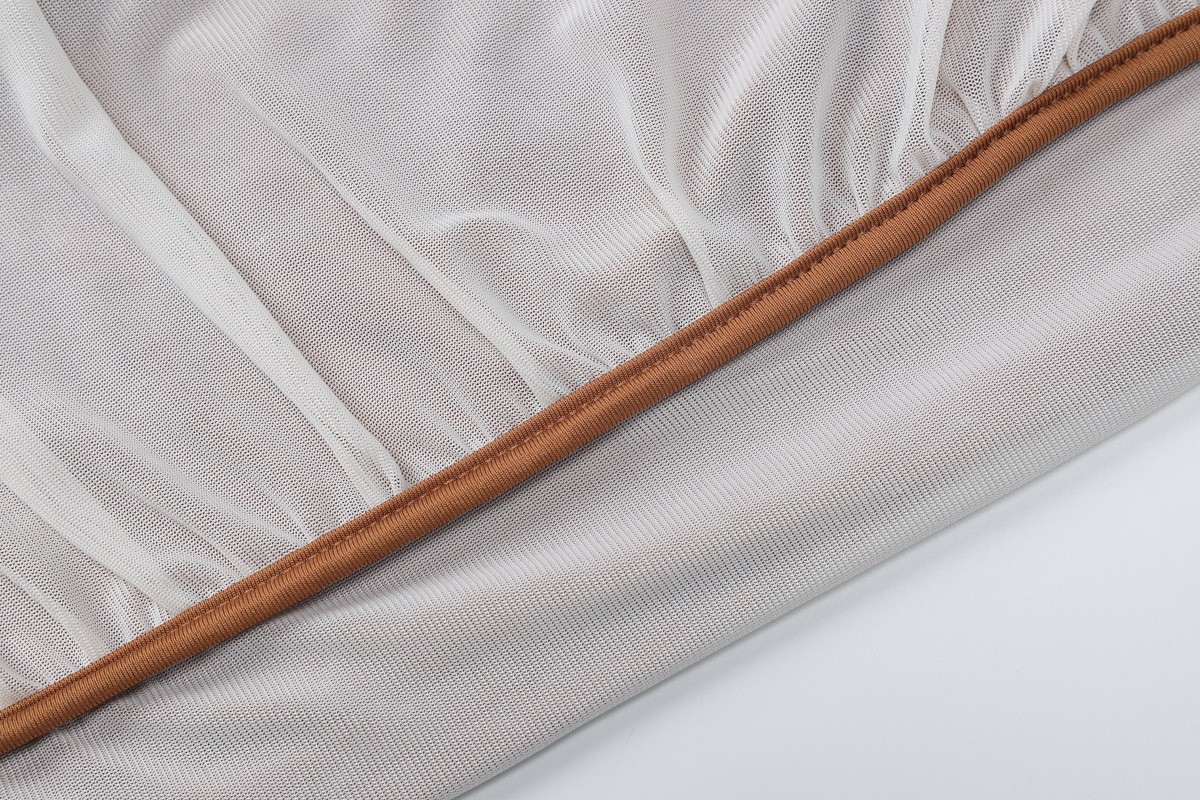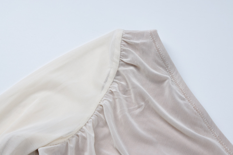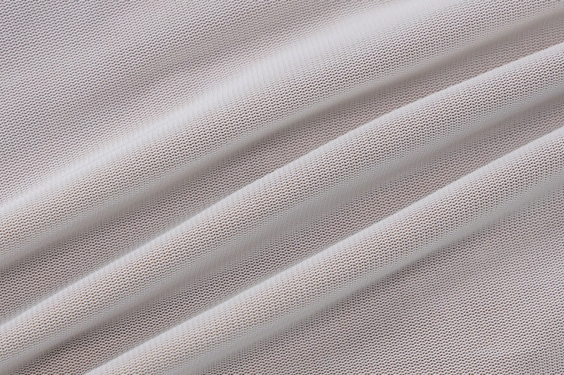 [涤纶和氨纶面料] 这款网纱连衣裙由涤纶和氨纶混纺制成,质地光滑、富有弹性,垂坠感极佳。涤纶确保了面料的耐用性并有助于保持其形状,而氨纶则增加了微妙的弹性,使穿着更加舒适,适合全天候穿着,并具有柔软的肌肤触感。 [设计特点] 这款连衣裙的斜肩领单边露肩设计引人注目,在诱惑与优雅之间取得了平衡,搭配网纱长袖,增添了轻盈、空灵的触感。网纱覆盖设计巧妙地延伸至衣身,营造出层次感,增强了浪漫氛围。修身收腰的剪裁凸显曲线美,中长裙的长度增加了精致感,融合了性感优雅的风格,打造百搭造型。