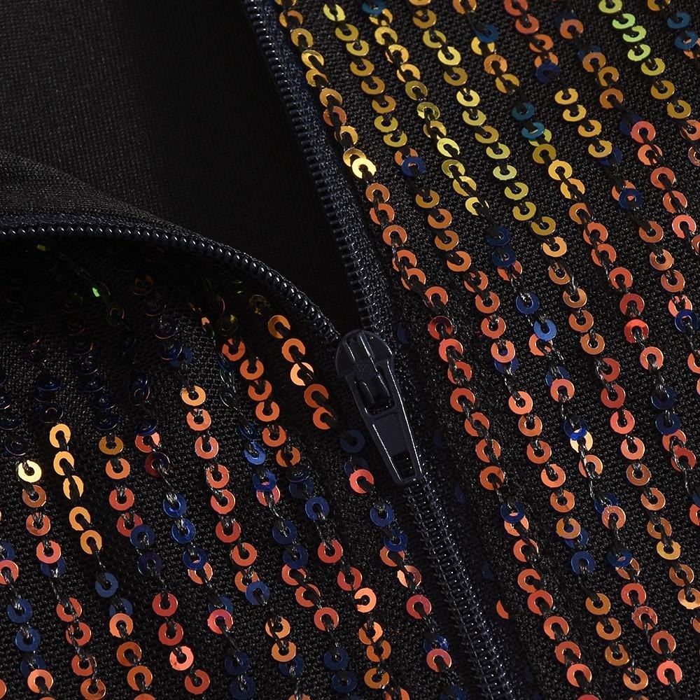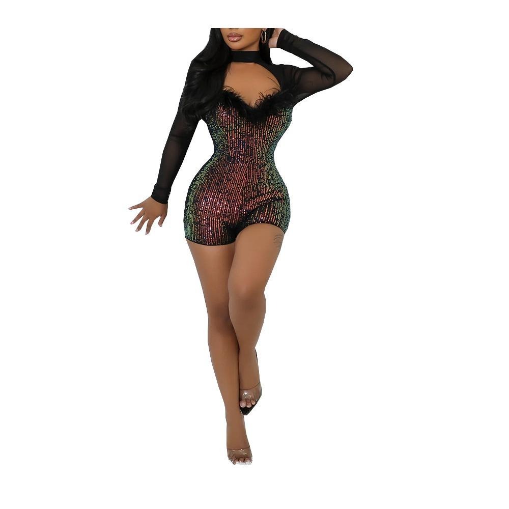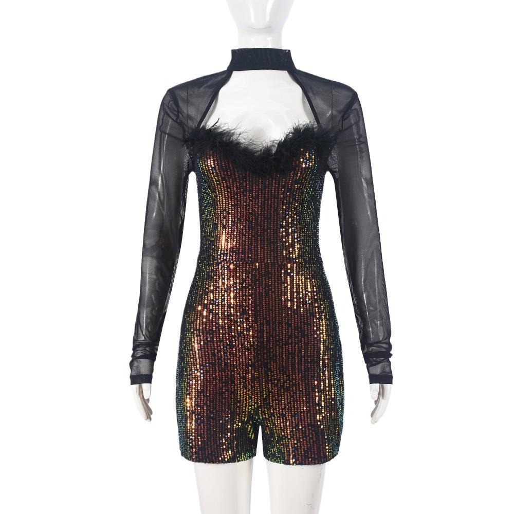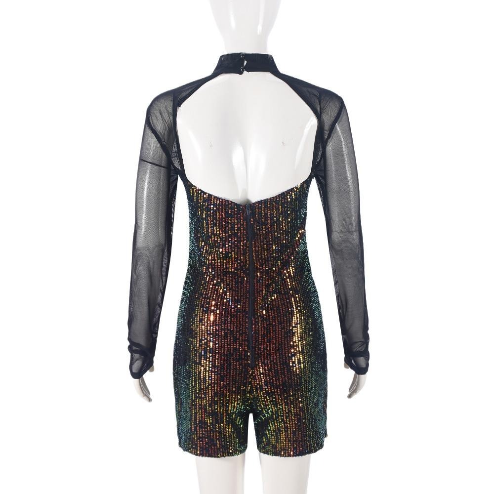 Women 2025 Sexy Dressy Long Sleeved, Hollowed Out Half High Neck Sequined Mesh Fabric Sparkle Sequin Jumpsuit Rompers