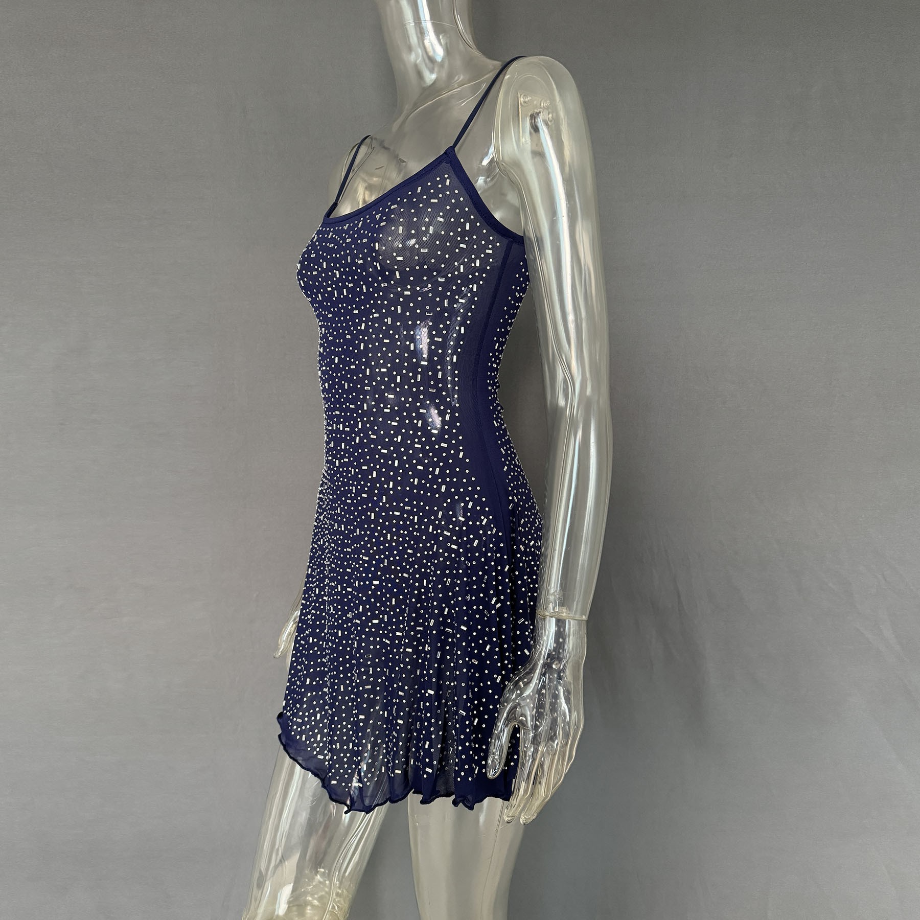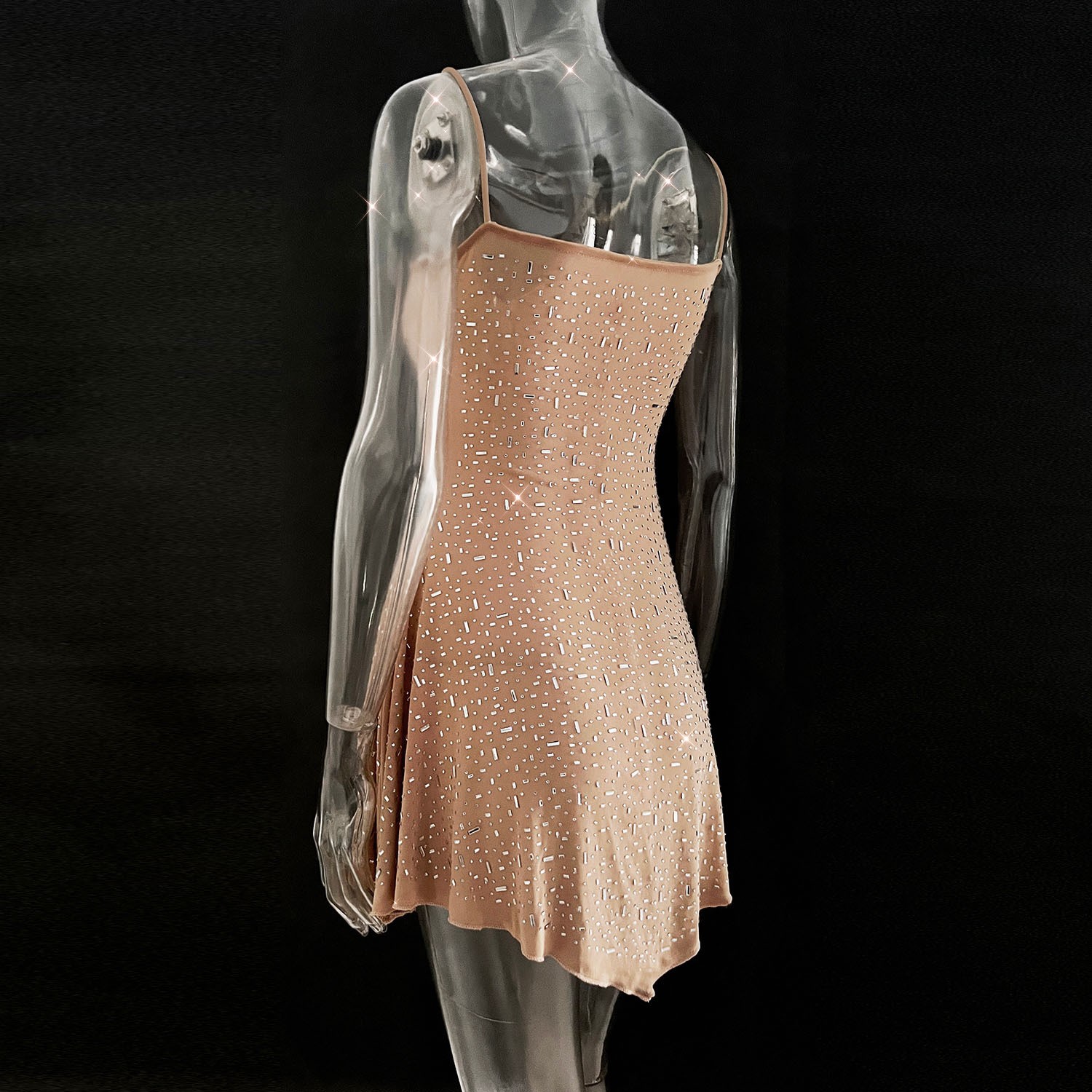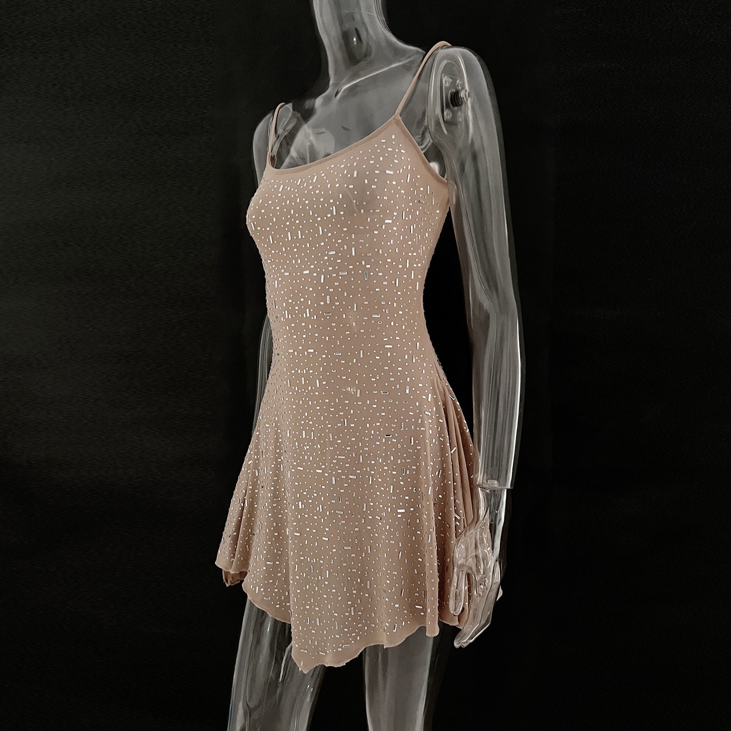 2025跨境爆款女装亚马逊速卖通独立站派对烫钻半透视吊带短连衣裙