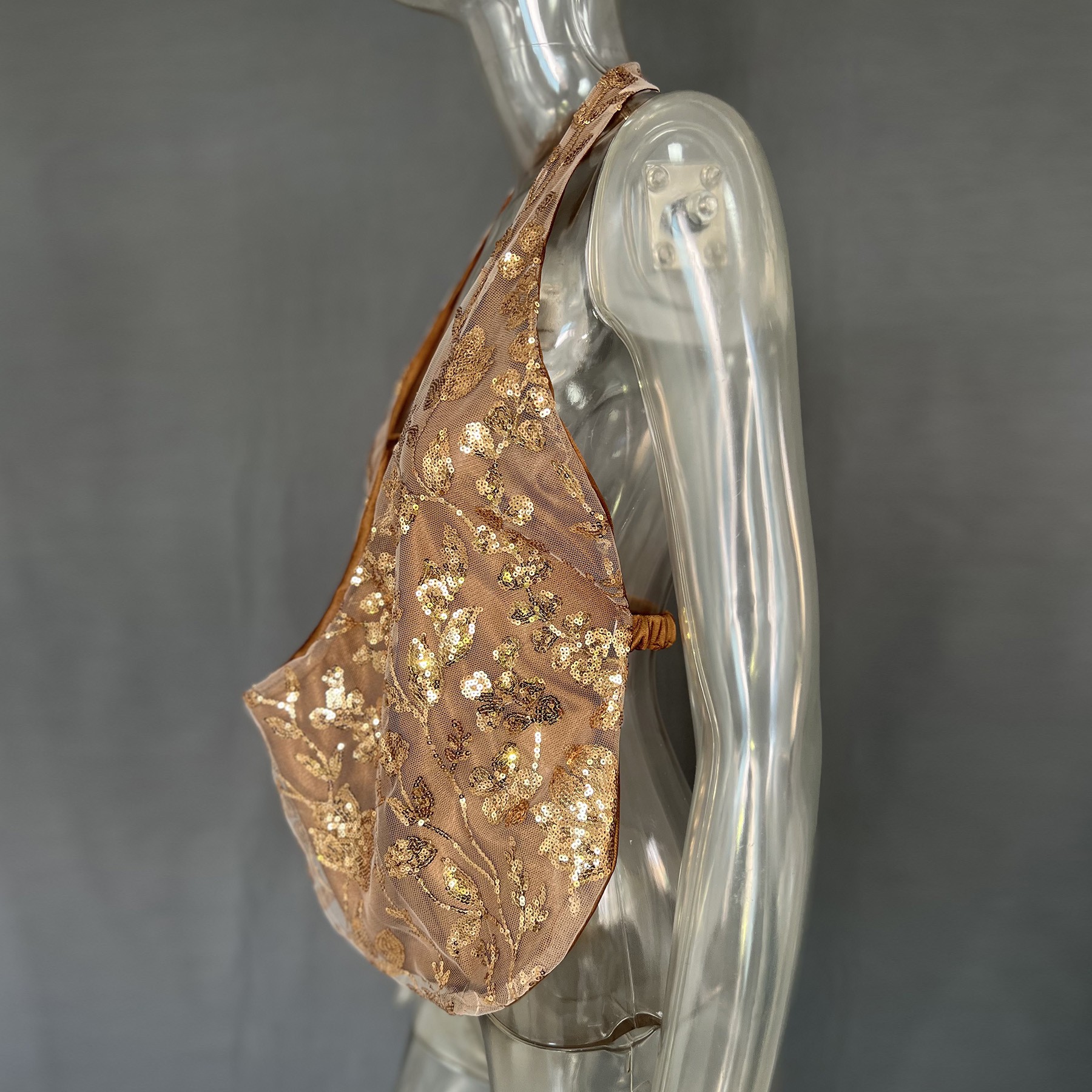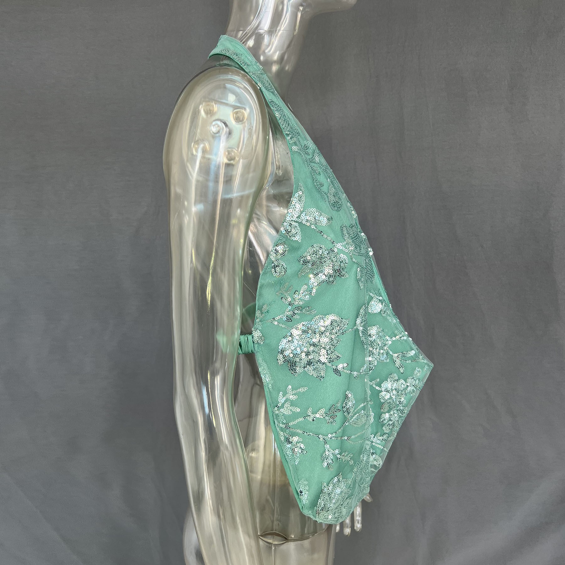 [Polyester Material] This spring/summer top is made from high quality polyester with a lightweight and breathable texture, perfect for warm weather. The polyester ensures that the sequinned floral print stays vibrant and secure, while also being durable enough to withstand regular wear and feel smooth against the skin [Design Features] This top features a striking plunging neckline with a deep V-neckline for added allure, and a sleeveless silhouette for a cool summer vibe. The wide pleated front creates a relaxed and airy feel, while the backless design accentuates the curves of the back, and the elasticated waistband at the back provides a comfortable fit. The mesh overlay adds a layer of sheer sophistication, and the sequinned floral pattern shimmers in the light for a striking finish
