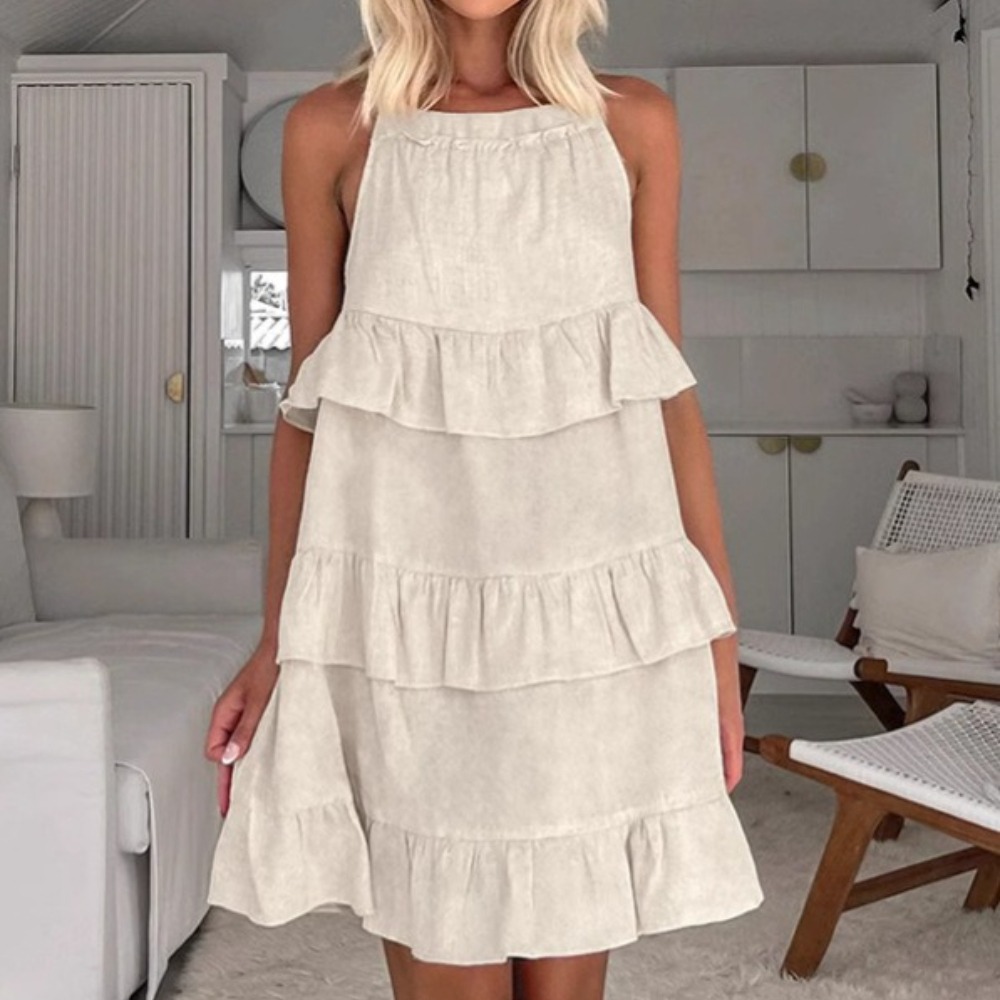 春夏度假风卡其色棉麻蛋糕裙设计感荷叶边方领连衣裙