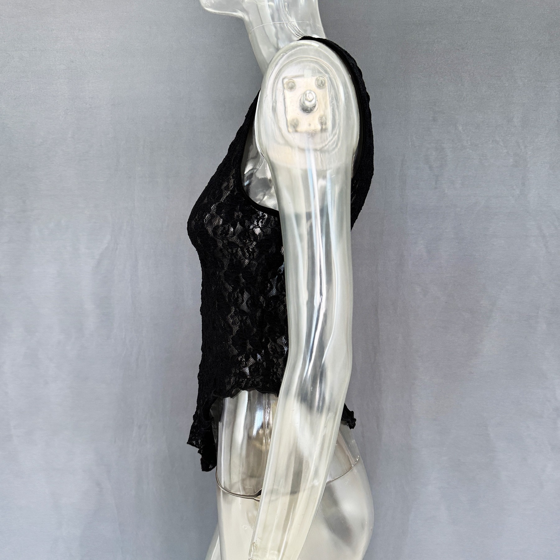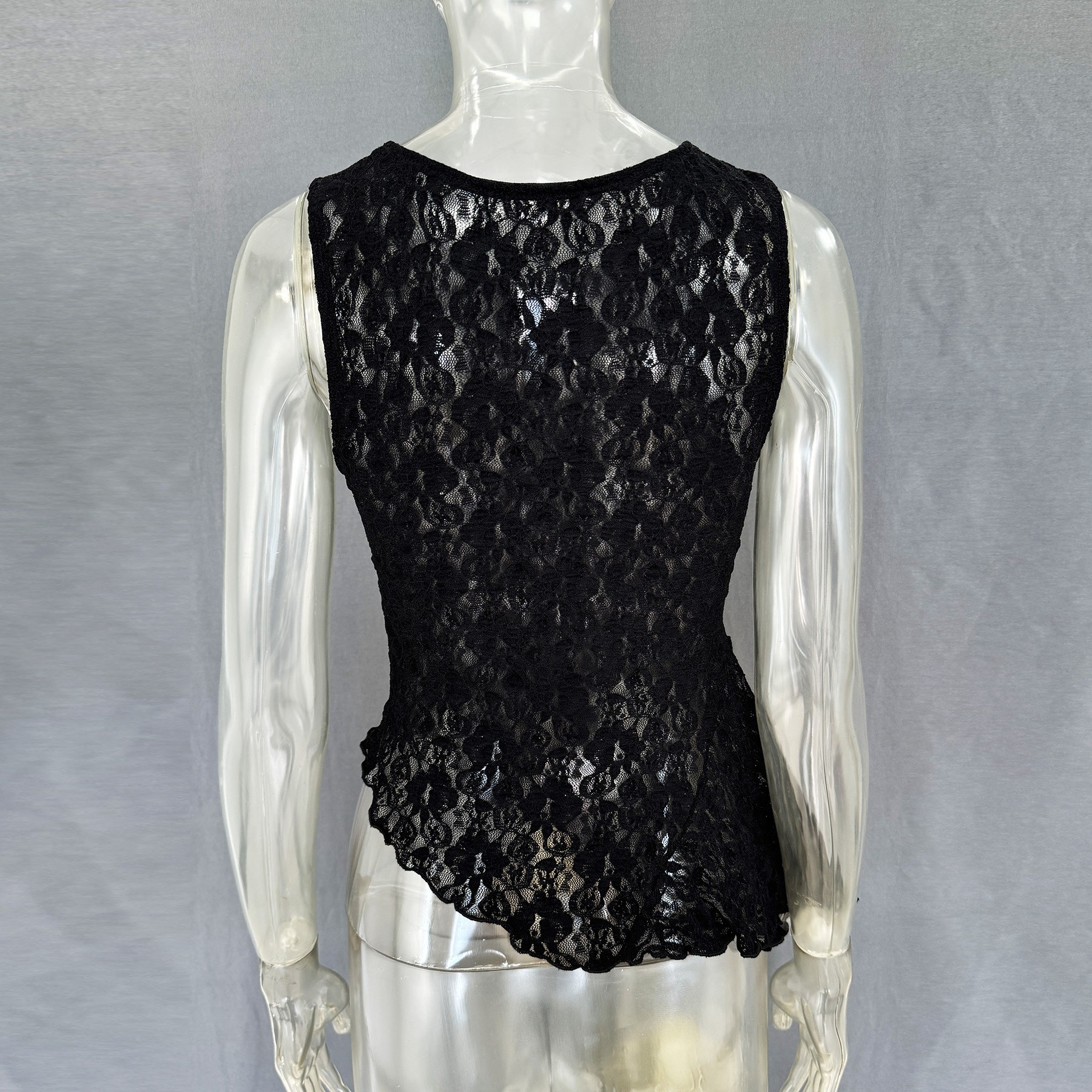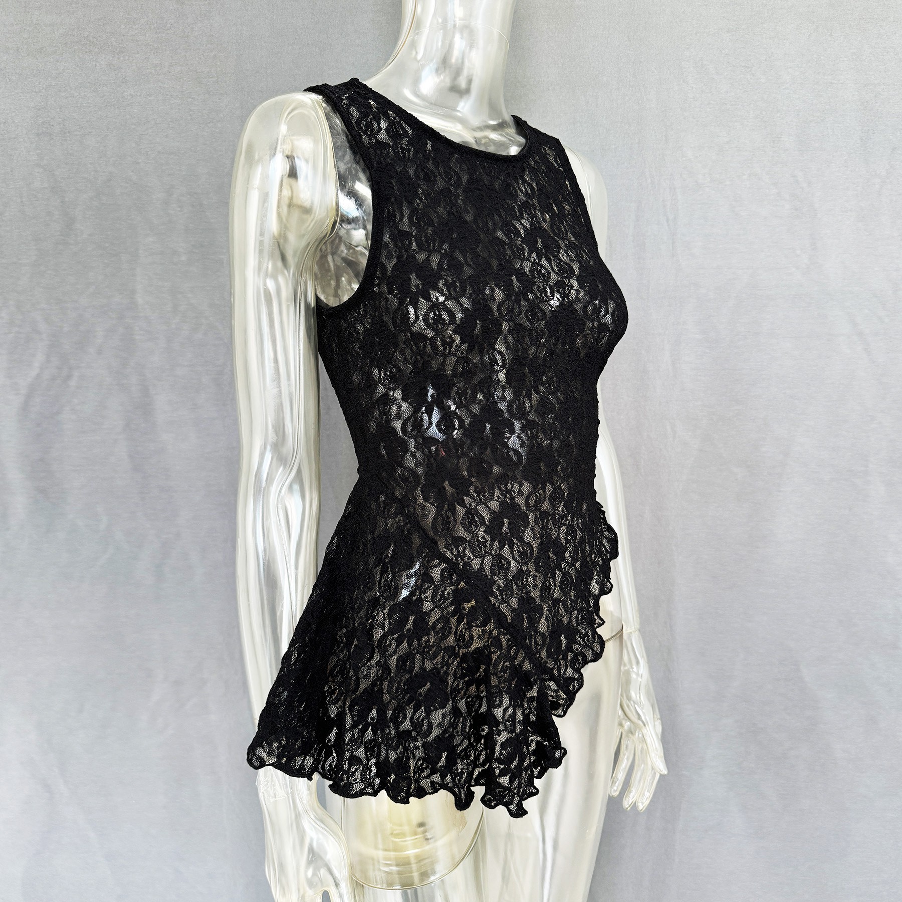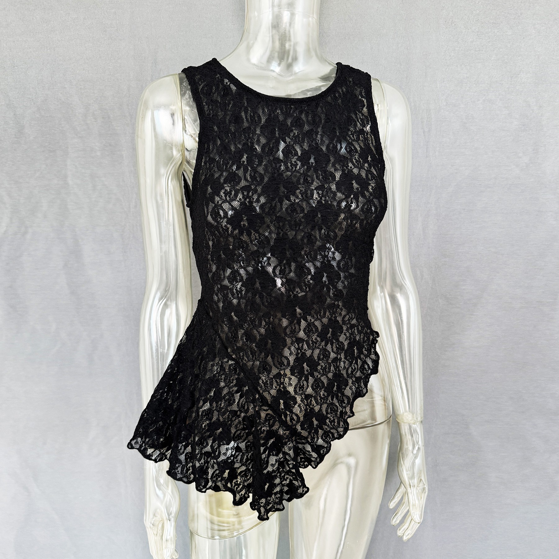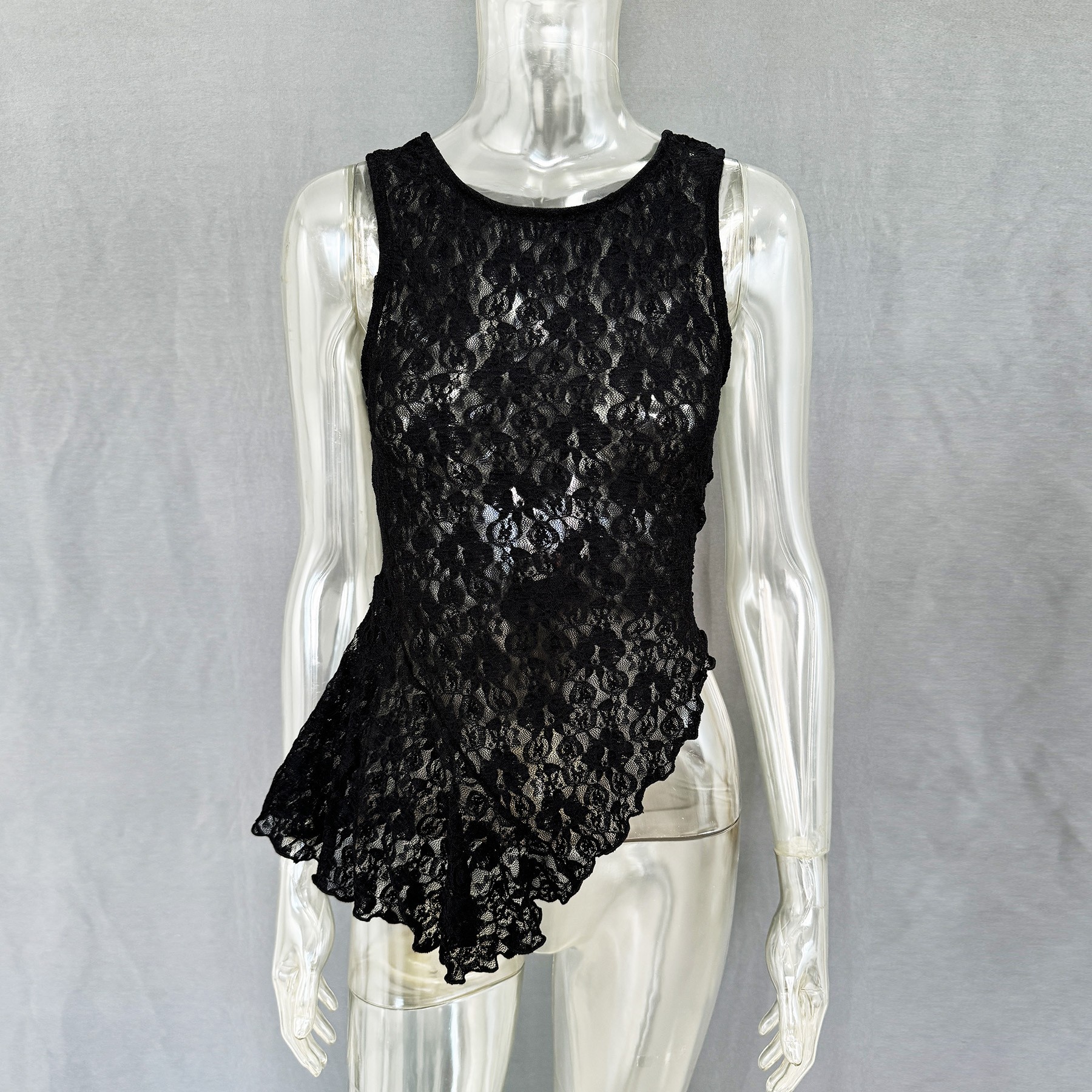 [Polyester Material] This spring/summer lace top is made from high quality polyester with a lightweight and breathable texture, perfect for warm weather. The polyester ensures that the delicate lace pattern retains its shape and definition while providing a smooth, soft feel against the skin for all-day comfort [Design Features] The round neckline and sleeveless design of this lace top is cool and comfortable, while the slim fit flatters your figure. The irregular hemline adds a dynamic and stylish touch, and the semi-sheer lace brings a subtle romantic allure, blending together to create a sexy and elegant style that is both sophisticated and eye-catching