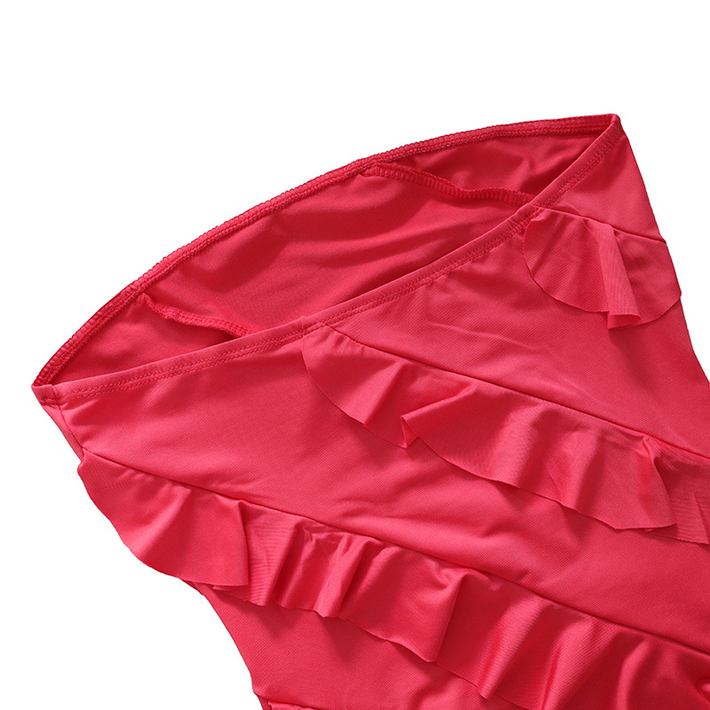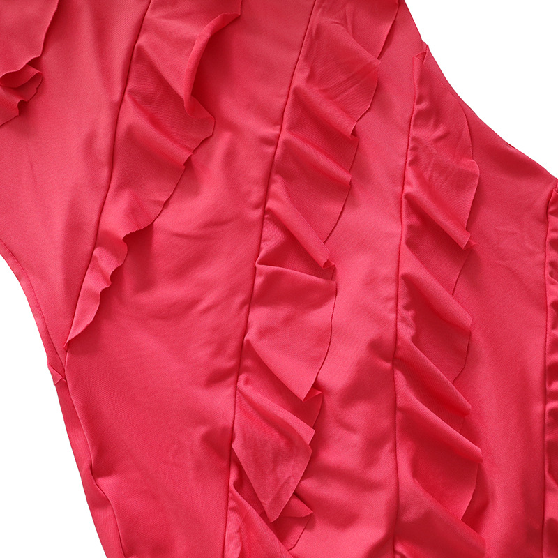 [涤纶和氨纶面料] 这款连衣裙由涤纶和氨纶混纺制成,面料轻盈而富有弹性,既美观又舒适。涤纶经久耐用,有助于保持连衣裙的形状,而氨纶则增加了弹性,使连衣裙更加贴身而不紧绷,非常适合在天气较热的时候穿着。 [设计特点] 这款连衣裙采用无袖露肩设计,突出肩部和锁骨;连体式短款剪裁修饰身材。裙摆上的荷叶边拼接增添了女性的动感,提升了整体魅力。这款设计体现了优雅与性感,在精致与大胆之间取得了平衡。