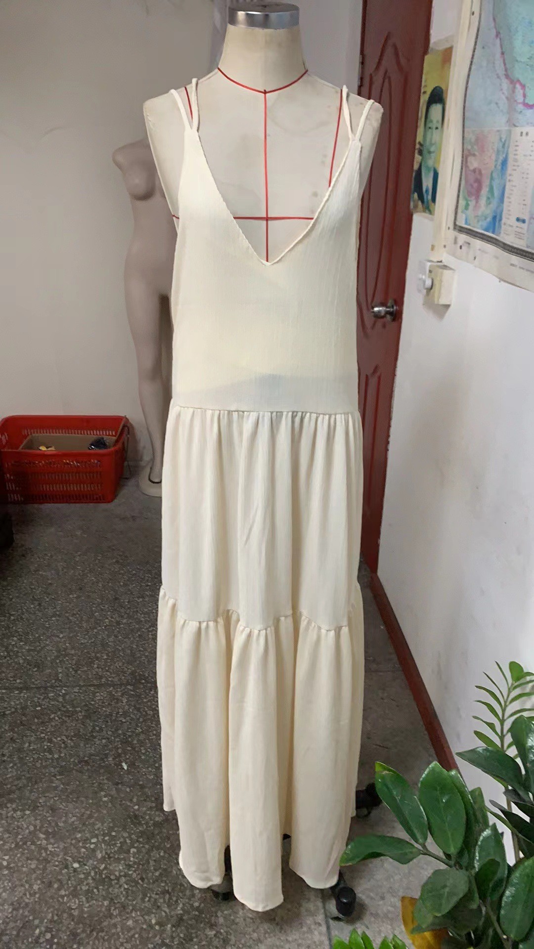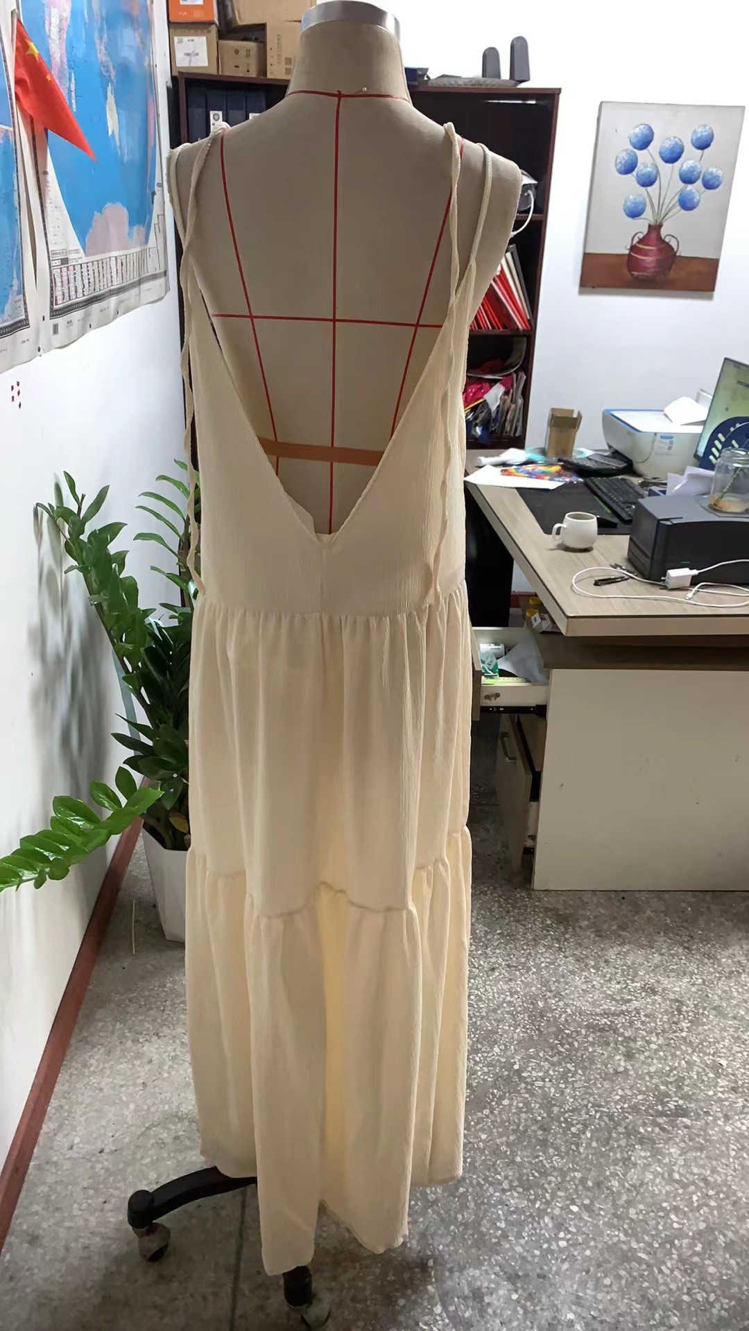 [涤纶面料] 这款简洁的连衣裙采用优质涤纶面料制成,轻盈舒适,非常适合温暖的天气。这种面料经久耐用,在穿着或水洗时都能保持形状,同时还能保持鲜艳的色彩。 [设计特点] 这款连衣裙的深 V 领设计突出了锁骨和胸部,增添了一丝诱惑。露背设计增添了一丝性感和优雅。宽松、飘逸的超大版型,打造舒适无忧的夏日造型。褶皱飘逸的及地裙摆在你行走时营造出引人注目的效果,多层次的下摆设计为裙子增添了立体感和动感。纯色设计赋予这款连衣裙经典永恒的魅力。