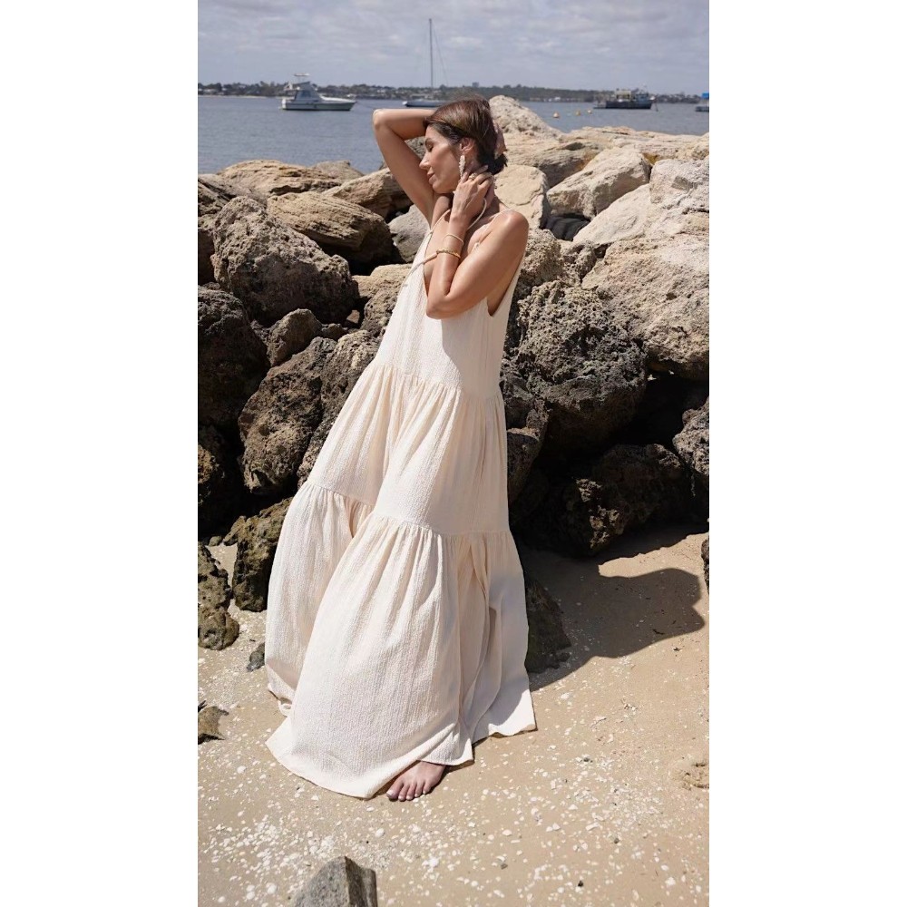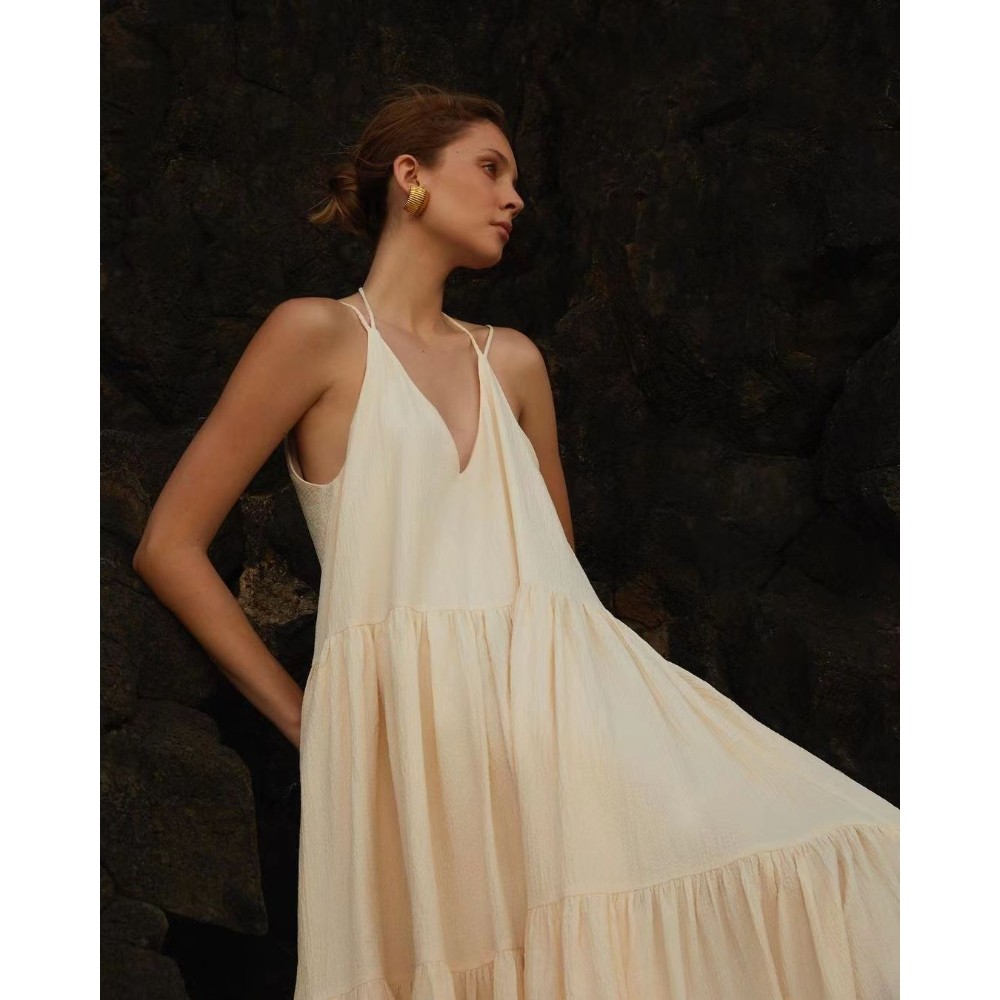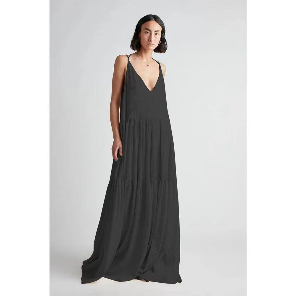 2024亚马逊跨境夏季欧女装宽松纯色褶皱不规则连衣裙沙滩吊带长裙