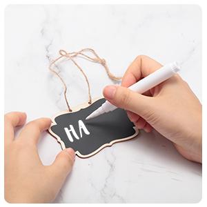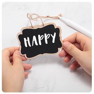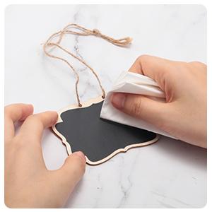 These hanging chalkboard signs are made of good quality wood, featuring a black chalkboard paint finish.Write with traditional chalks on both sides and simply wipe it with a damp cloth. Please note that liquid chalk markers are not erasable on these blackboards.