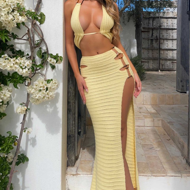 【产品】我们的女士针织沙滩遮阳套装,为您提供时尚的防晒,让您轻松享受沙滩优雅。这种轻薄、纯粹的遮盖物在你的曲线上漂亮地垂下,在不牺牲透气性或风格的情况下提供适量的覆盖。无论你是沿着海岸漫步,在泳池边闲逛,还是在海滩俱乐部享受热带鸡尾酒,这套套装都能让你看起来很时髦,同时保护你的皮肤免受强烈的紫外线伤害。波西米亚风格的设计从实用的泳装封面无缝过渡到时尚的度假服装,简单的配件变化 【优质的材料和周到的结构】由优质柔软的棉混纺纱线制成,钩针编织的覆盖物具有卓越的透气性和速干性能,非常适合海滩环境。织物具有复杂的开放式编织图案,允许空气流通,同时提供微妙的紫外线防护,在所有应力点加强缝合,以提高耐用性。这一套是在平静的中性色调,补充所有肤色,并与其他泳衣很好地混合 【场合和造型的可能性】这款多功能套装是您所有温暖天气探险的完美伴侣。在沙滩上穿它,配上宽边帽和凉鞋,完全是度假风格的魅力。当束上腰带时,这种遮盖物也可以成为一件时髦的连衣裙,非常适合在海滩俱乐部吃午餐或在日落时分散步。在泳池边闲逛时,比基尼搭配短裤和背心即可。中性的调色板与你的系列中的其他泳装和遮盖物毫不费力地协调。晚上参加沙滩派对时,可以在牛仔夹克下面穿,或者在连体泳衣外面穿。这种轻便的织物很容易装在你的沙滩包里,不会起皱,是旅行和度假衣柜的理想选择 【护理说明和尺寸信息】为了保持本产品的质量,请在冷水中用温和的洗涤剂单独手洗,并平躺在阴凉处晾干。避免拧或扭转钩针罩,以防止拉伸。每次使用后,比基尼应在盐水或氯中彻底冲洗。不使用时请存放在阴凉干燥处,避免阳光直射