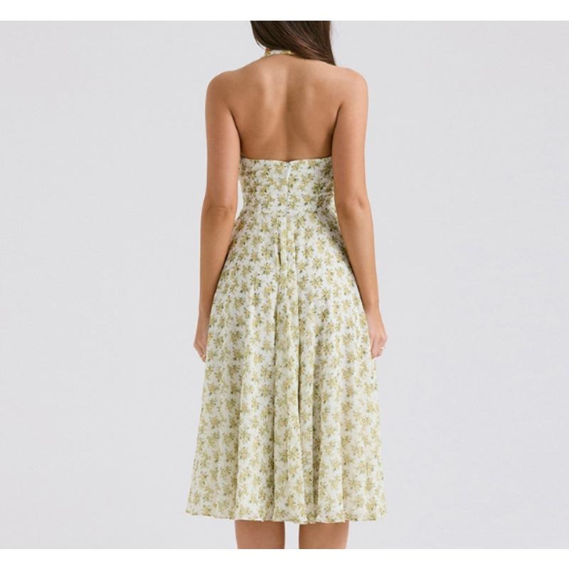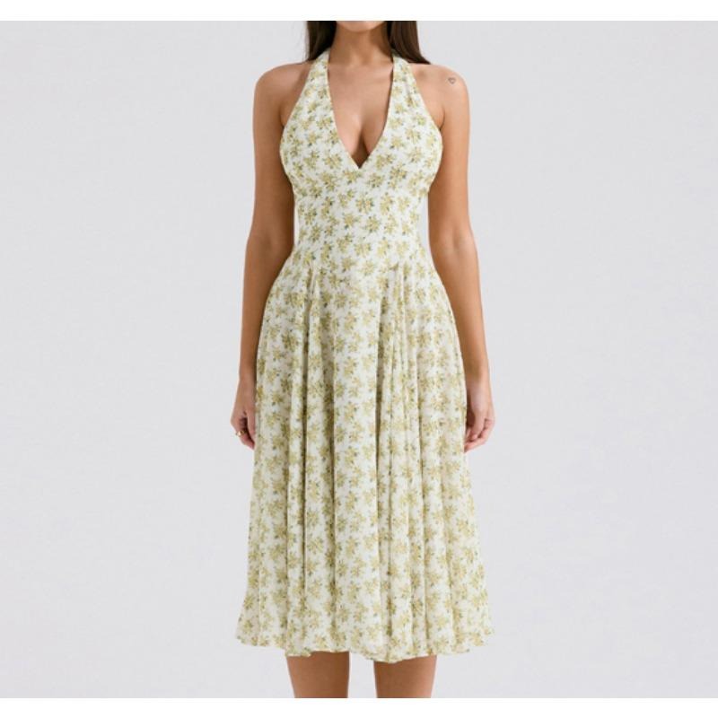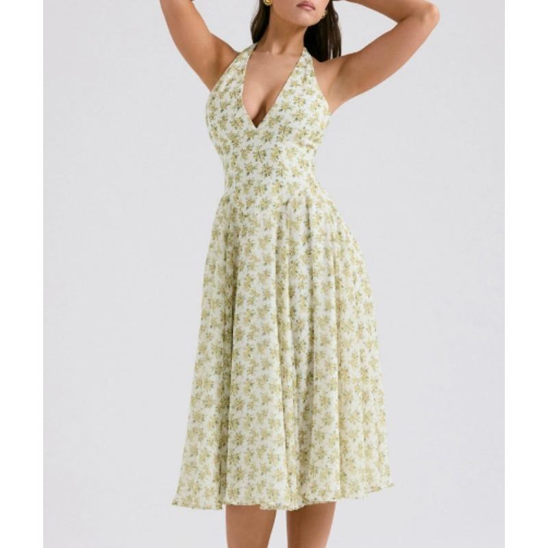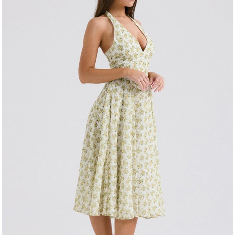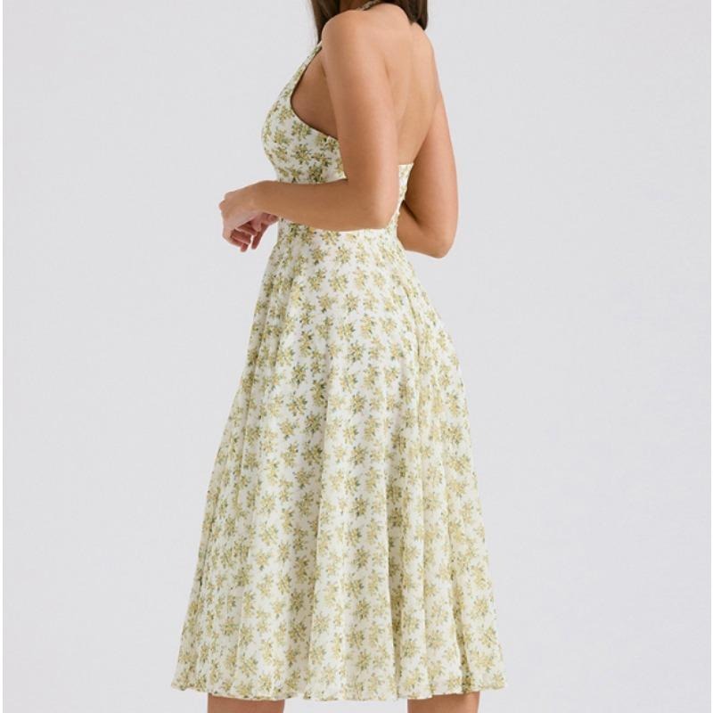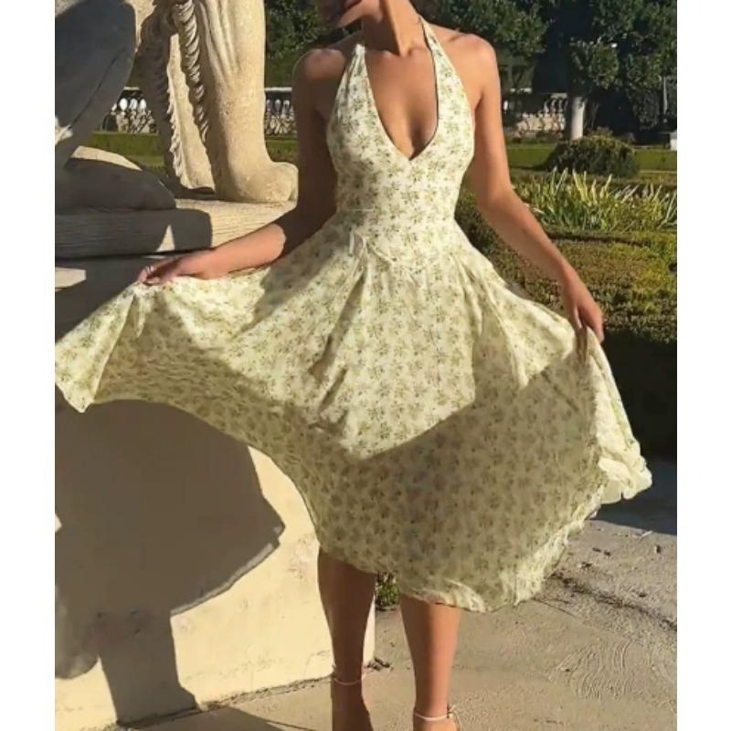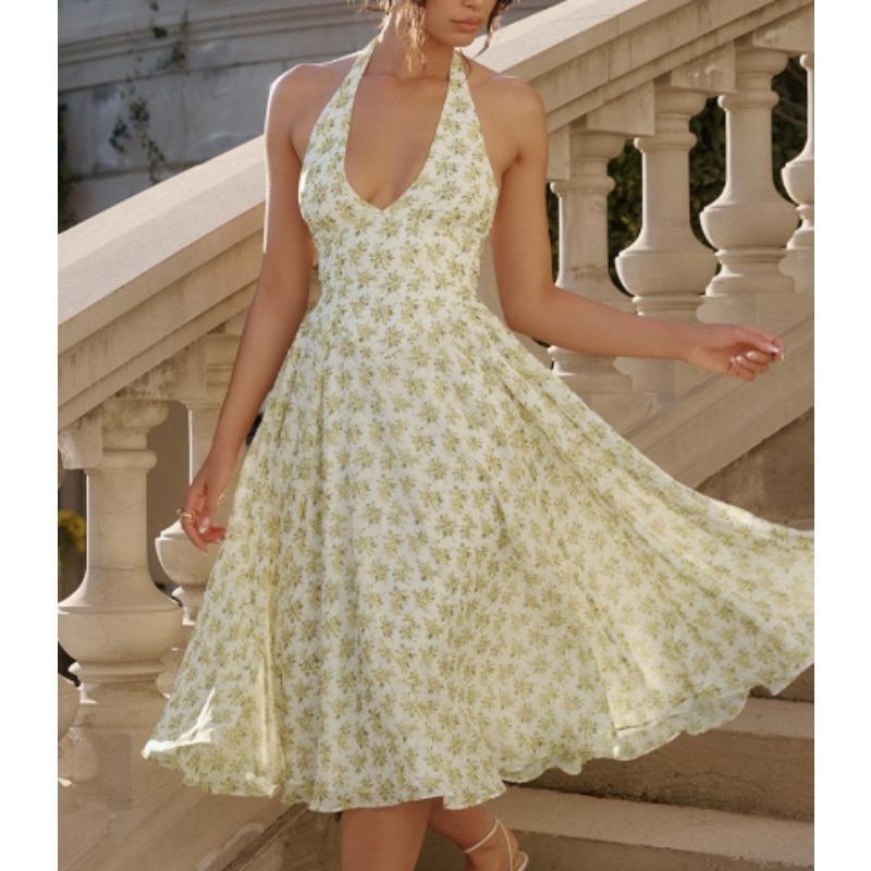 Women Sweet Summer Style Backless, Halter, Fashionable Floral Patterned, Cinched Waist, Versatile large-hem Dress