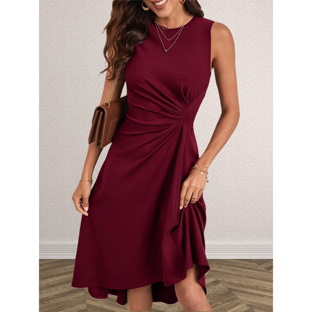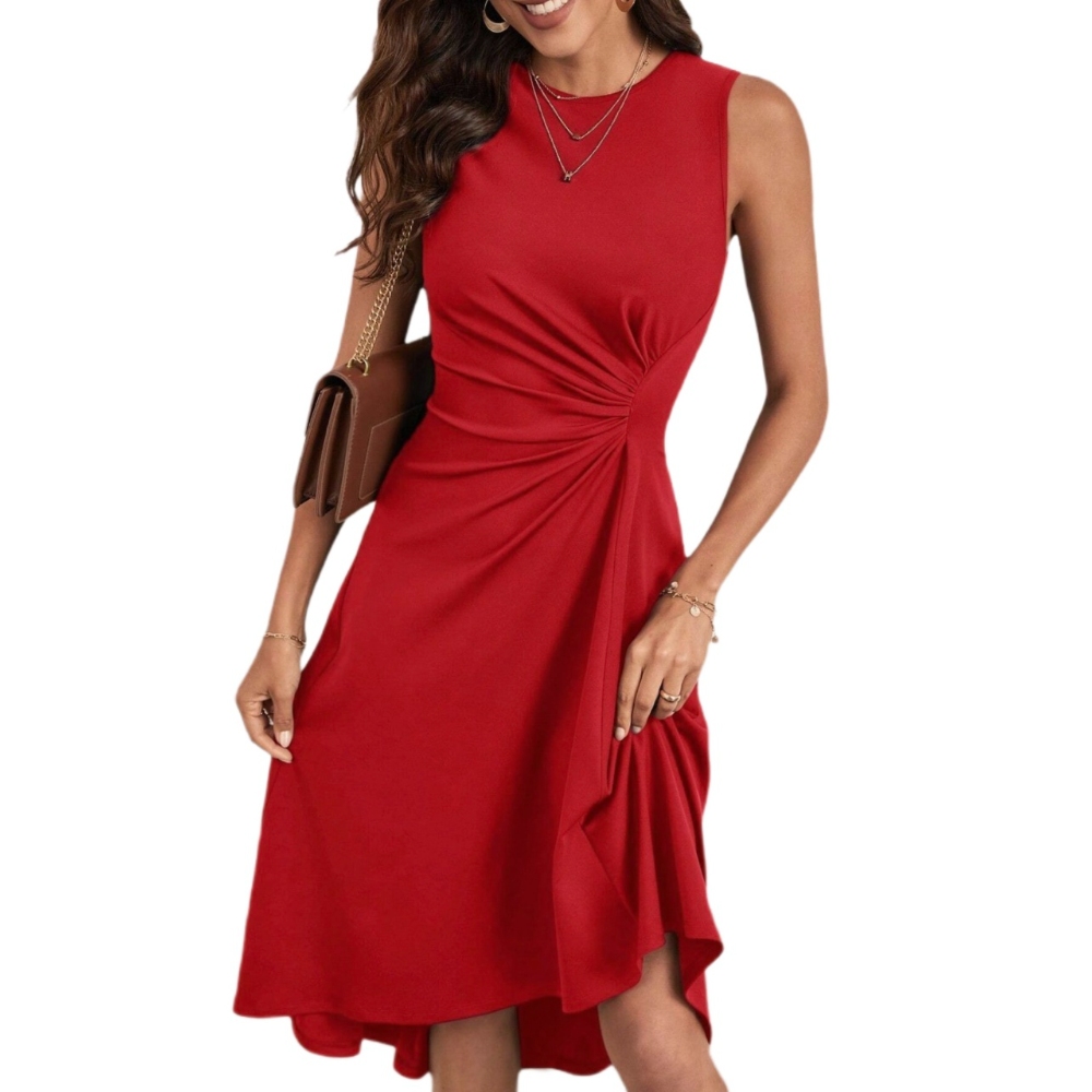 [涤纶面料] 这款连衣裙采用优质涤纶面料制成,轻便、舒适、耐用。光滑透气的面料让你在过渡性天气中也能保持凉爽,同时还能保持光滑亮丽的外观,非常适合日常穿着。 [设计特点] 经典的圆领设计打造出永恒、精致的外观。优雅的轮廓在身体上柔和地垂坠,兼顾了舒适与精致的风格。腰部两侧微妙的褶皱收紧了你的身材,营造出曲线优美的匀称轮廓,突出你的自然体形。不规则的流线型下摆增添了动感和奇思妙想,每走一步都摇曳生姿。纯色的色调散发出低调的优雅,使这款连衣裙成为衣橱中的百搭必备单品。
