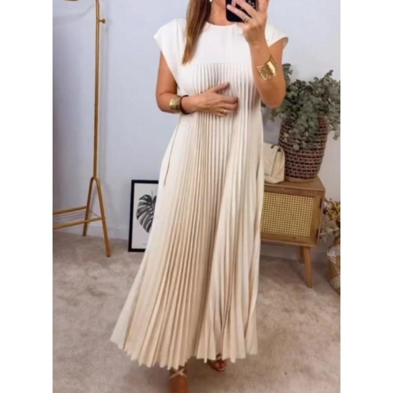 女性夏季褶皱及地长裙休闲短袖圆领飘逸摆动长连衣裙与口袋