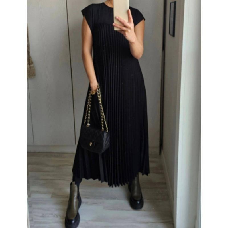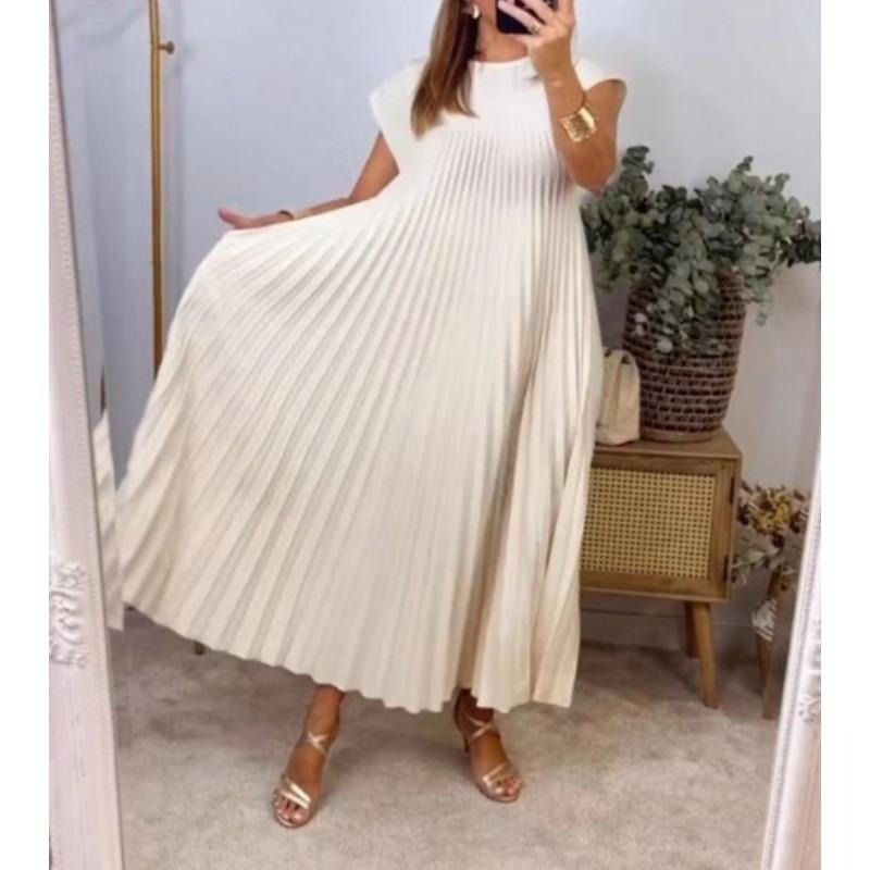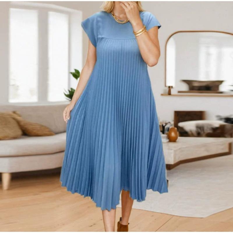 Women Summer Pleated Maxi Dress Casual Short Sleeve Crewneck Flowy Swing Long Dress with Pockets
