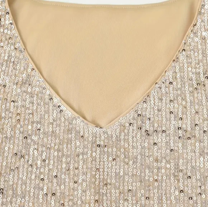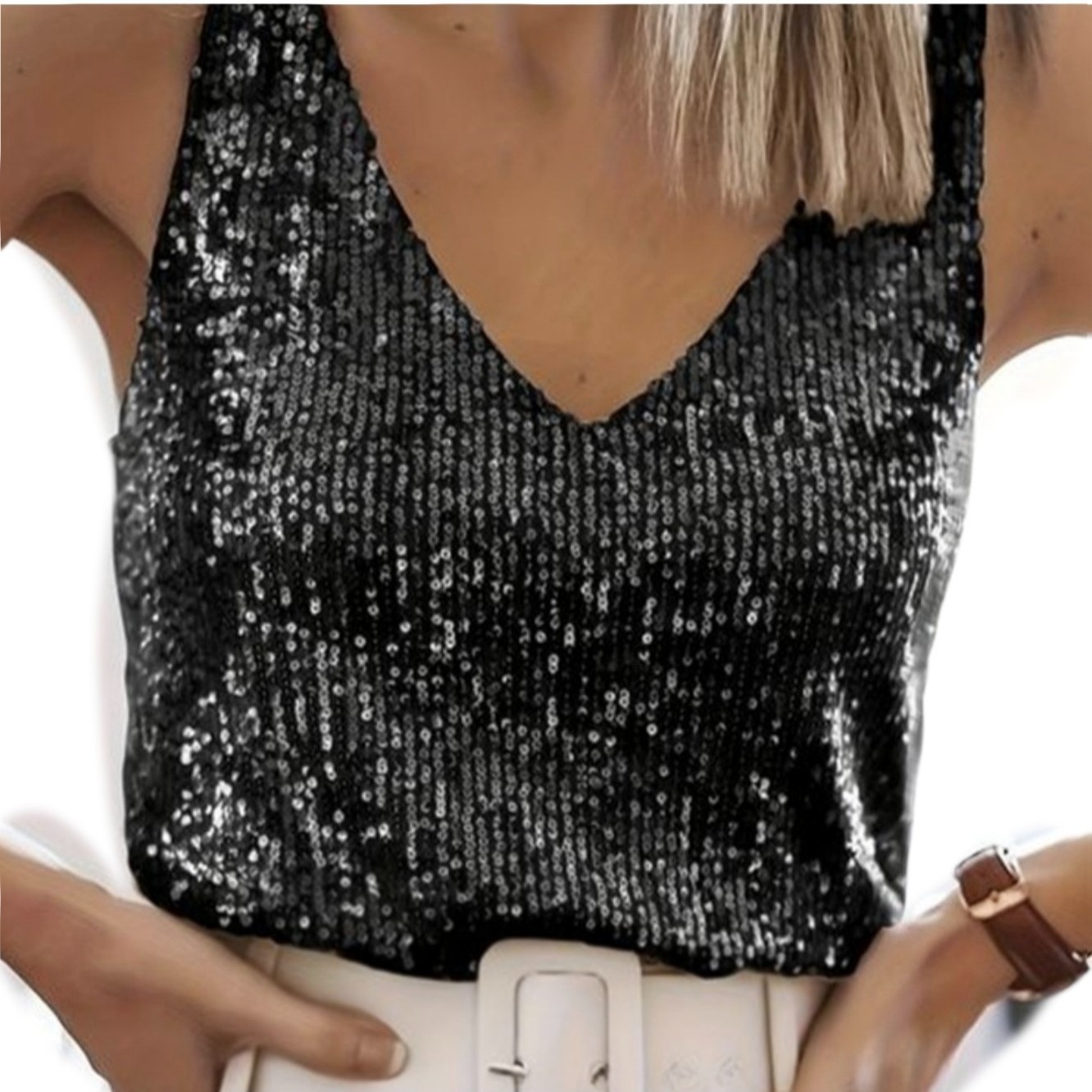 [氨纶面料] 这款上衣采用优质氨纶面料制成,具有超强的弹性和柔韧性,确保穿着舒适,并能随身体移动。面料触感柔软,透气性好,可保持形状,适合全天候穿着,同时又不失时尚感。 [设计特点] 平 V 领设计凸显锁骨,增添优雅气质,无袖剪裁让你在炎炎夏日倍感凉爽。这种经典的设计能展现你丰满的肩膀,营造出性感、自信的造型,是温暖季节的最佳选择。耀眼的亮片覆盖了整件上衣,一举一动都能捕捉到光线,让你成为众人瞩目的焦点。宽松的版型在身体上垂坠优美,给人舒适轻松的感觉。尽管设计宽松,但仍能起到微妙的修身效果,让您的身材更显玲珑有致。