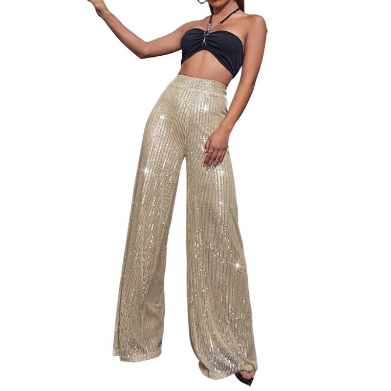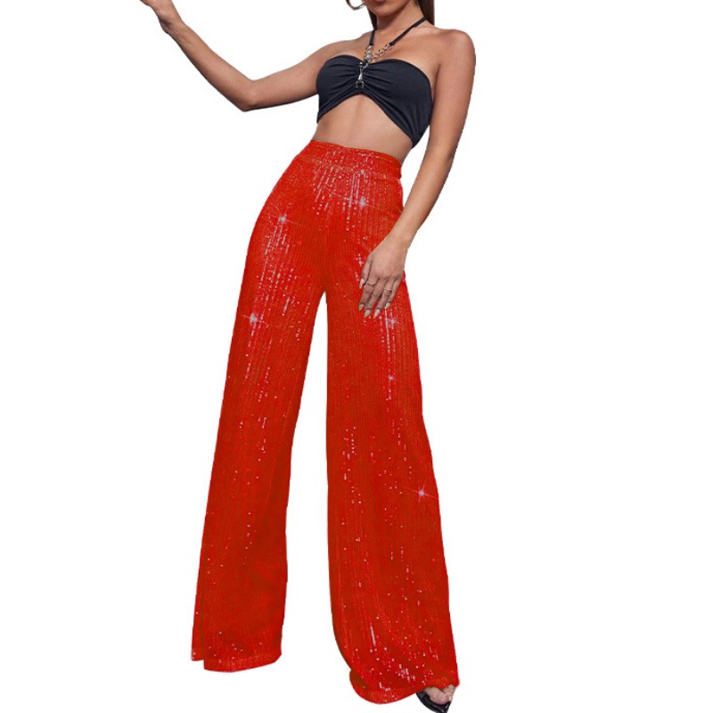 Women's Sequin Lounge Pants, Elastic High Waist Wide Leg Pants, Glitter Embellished & Flowy, Summer Casual Palazzo Trousers
