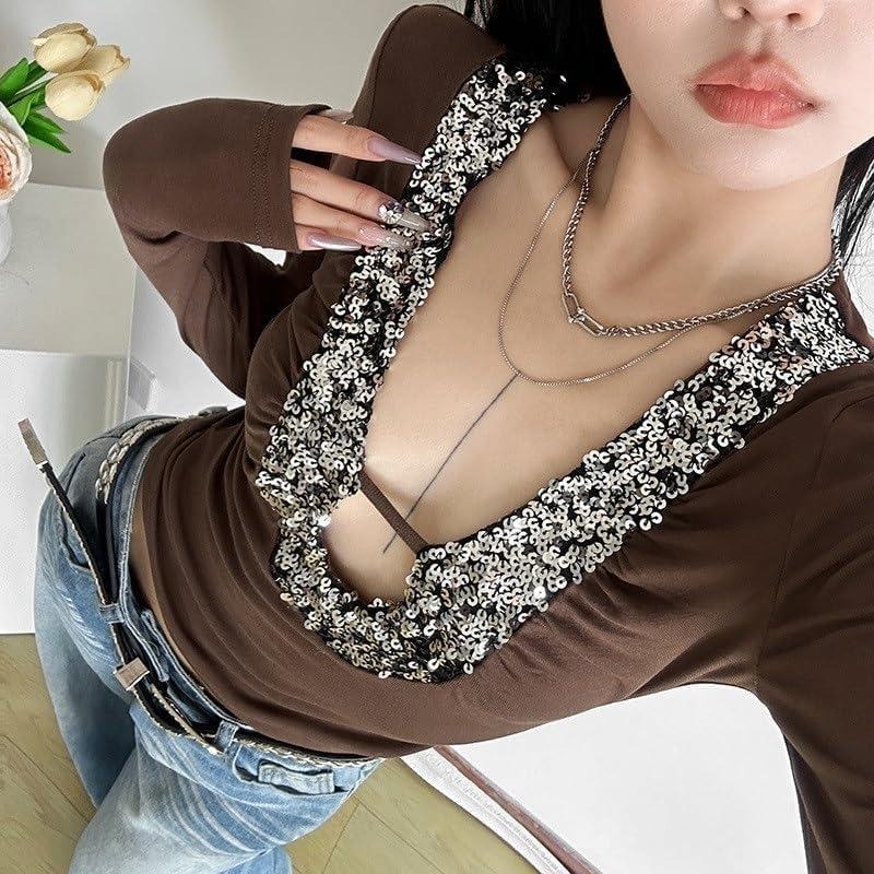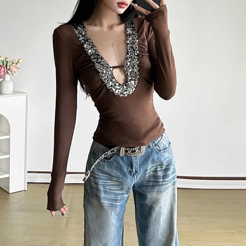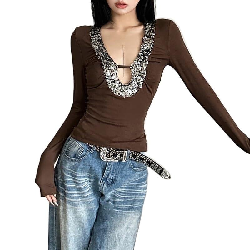 Women's Fashion Sexy Long Sleeve Sexy V Neck T-Shirt Women's Sequined Decorated Collar Slim Fit Top