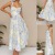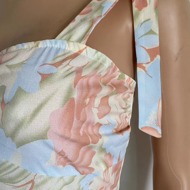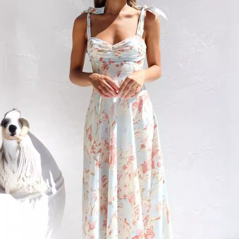新款修身显瘦收腰V领吊带印花中长款连衣裙女
