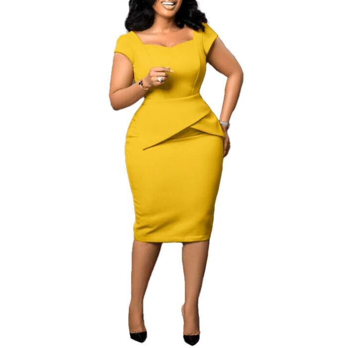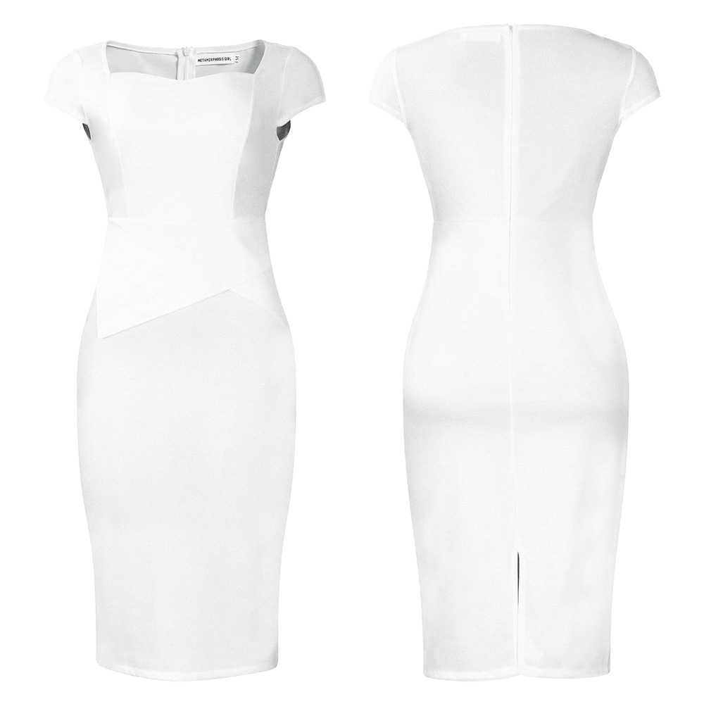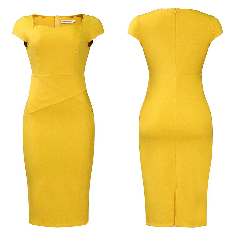 [涤纶面料] 这款连衣裙采用优质涤纶面料制成,轻便、舒适、耐用。面料触感柔软,透气性好,能让你一整天都保持凉爽,即使经过多次洗涤,形状和颜色依然鲜艳,确保持久穿着。 [设计特点】迷人的甜心领口能完美修饰锁骨,增添女性的优雅气质。短袖平衡了整体造型,非常适合在温暖的天气里穿着,收腰设计突出了您的曲线,塑造出妩媚的轮廓,散发出自信和魅力。独特的交叉拼接下摆设计为经典的办公连衣裙增添了现代气息。这款连衣裙以纯色为主色调,散发着精致和低调的奢华,简约的美感使其成为百搭的主打产品,可轻松融入职业和半正式场合。
