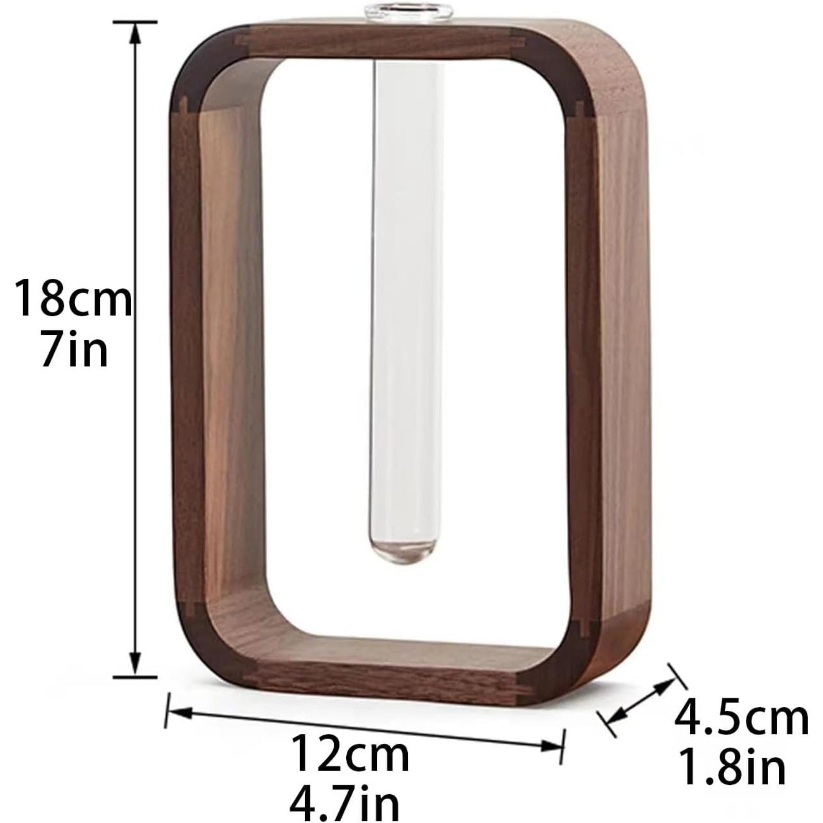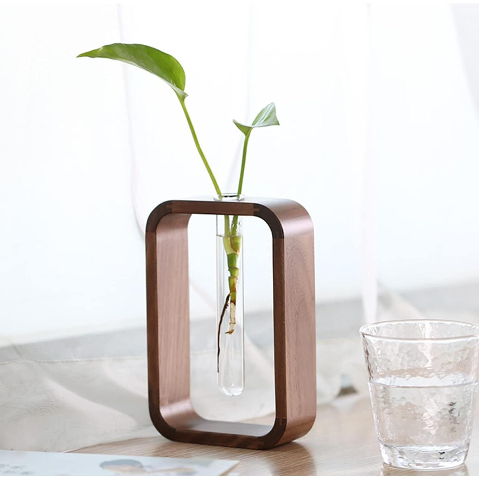 Transprent Glass Vase Test Tube Vase Hydrophilic Plants Vase Plant Holder Walnut Wooden Frame Flower Stand Table Garden Bonsai Decor,Gifts for Women, Home Office Decor Planter (Small)