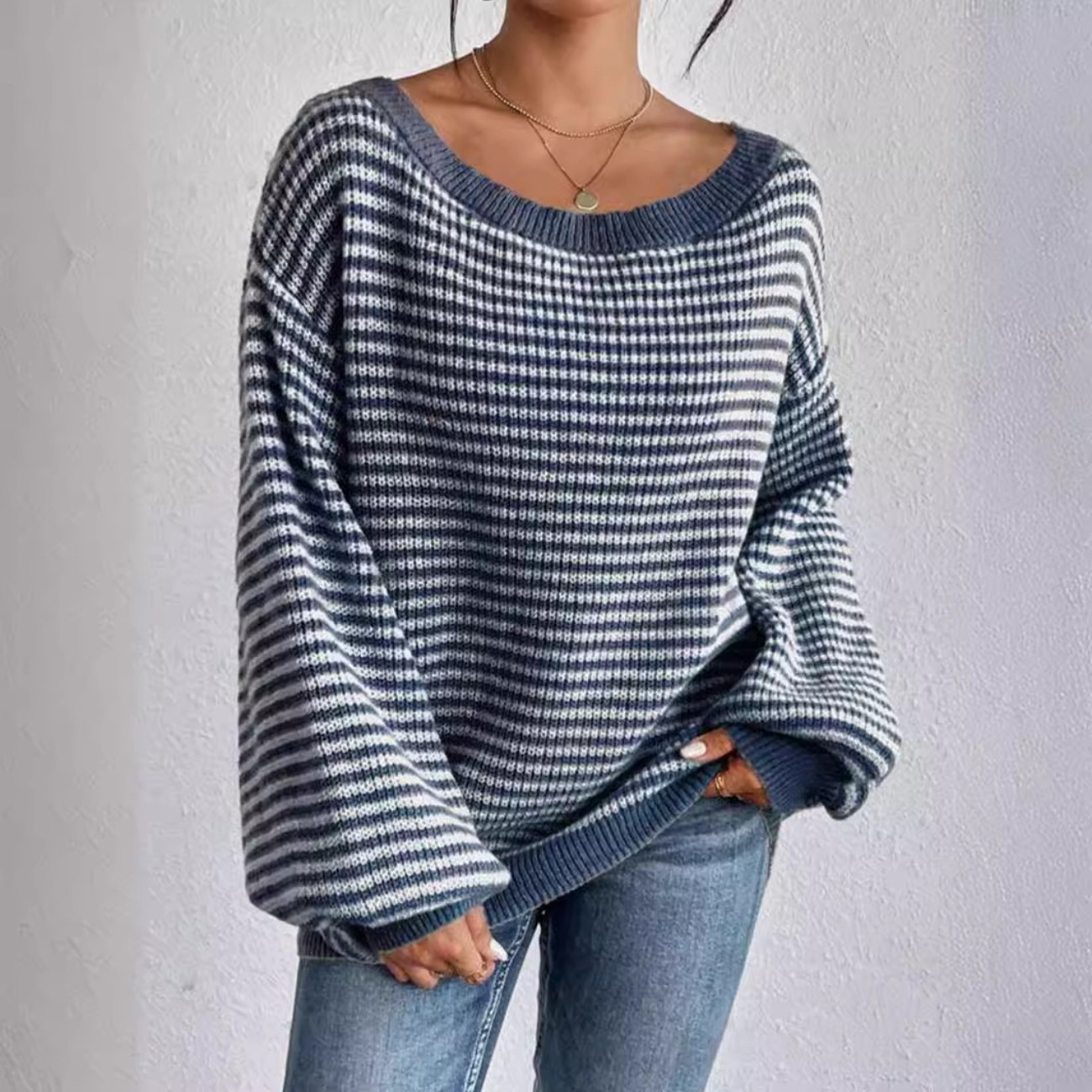 女士露肩毛衣长袖针织衫宽松套头毛衣上衣